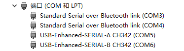 )。给开发板插上电源,Debug USB 链接笔记本,之后打开笔记本的设备管理器,在端口(COM 和 LPT)可以看到会多出来 COM5 和 COM6,选择串口连接COM5 (USB-Enhanced-SERIAL-A CH342 (COM5))