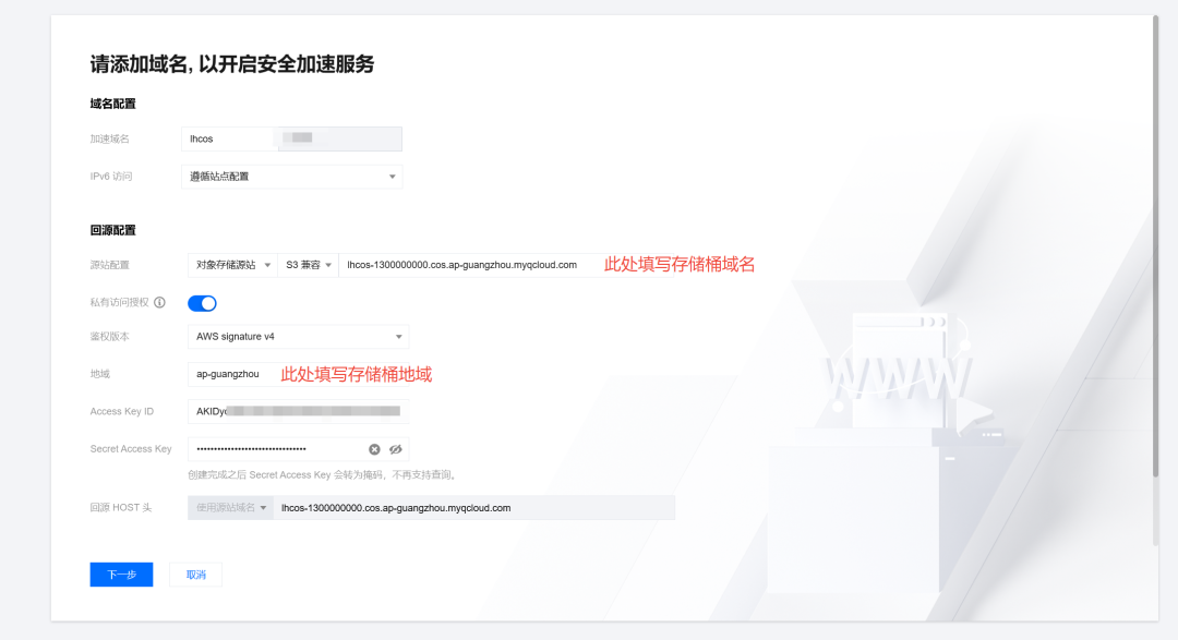 源站配置选择⌜对象存储源站-S3兼容⌟;勾选私有访问授权后填写子用户的AK、SK即可。