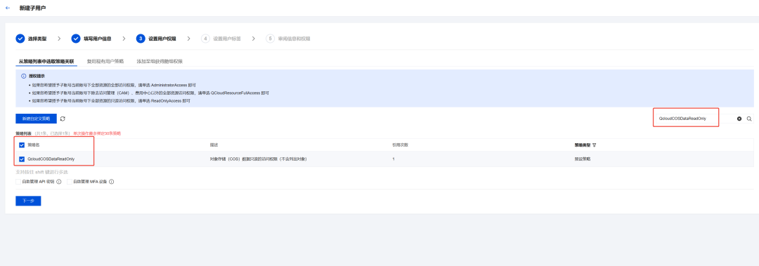 2. 授予QcloudCOSDataReadOnly权限。该权限允许只读账号下所有对象存储数据(不含列出对象),若有精细化权限控制需求请使用自定义策略。