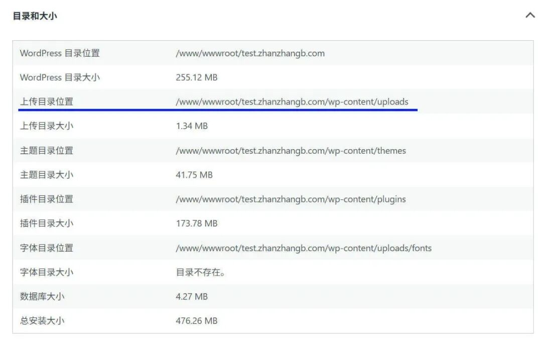 服务器挂载目录:这需要填写绝对路径。使用宝塔面板的用户,创建的站点默认路径为:/www/wwwroot目录下,如果不确定绝对路径,可以在“WordPress后台 > 工具 > 站点健康 > 信息”中查看,如下图: