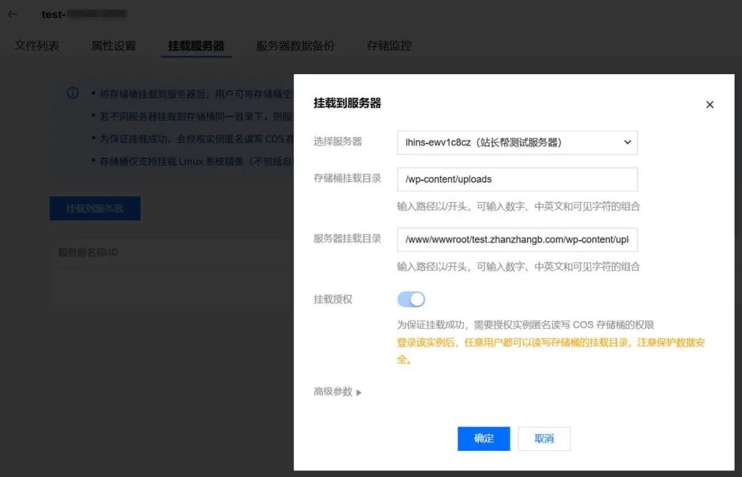 WordPress的上传目录路径为:站点根目录/wp-content/uploads ,那么存储桶需要挂载的路径也应与之对应。在执行挂载之前,如果该目录下已有文件,需要先备份到它处,然后暂停站点访问功能并删除/wp-content/uploads目录下所有文件及目录,否则会挂载失败。