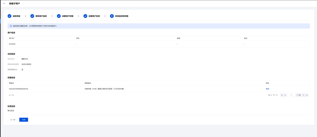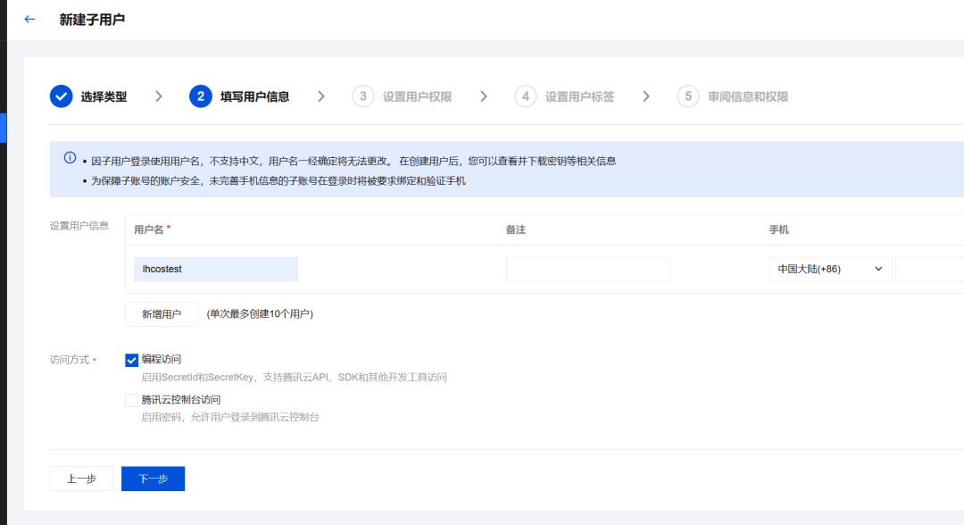 1. 首先前往访问管理创建子用户,勾选编程访问。