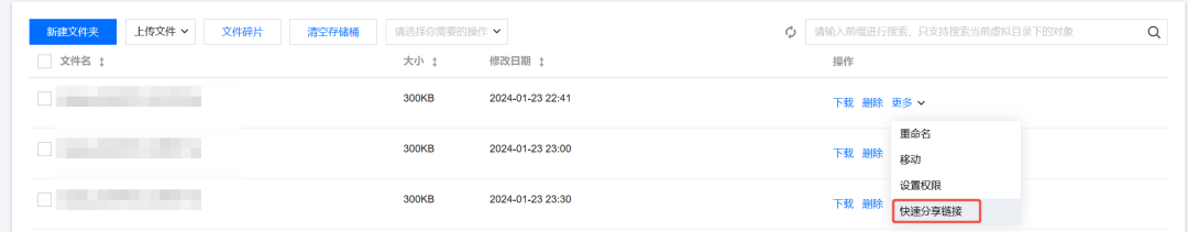 可选择任意存储桶内文件,点击快速分享则可获取到存储桶域名,若无文件也可选择自行拼接,可参考此文档:地域和访问域名