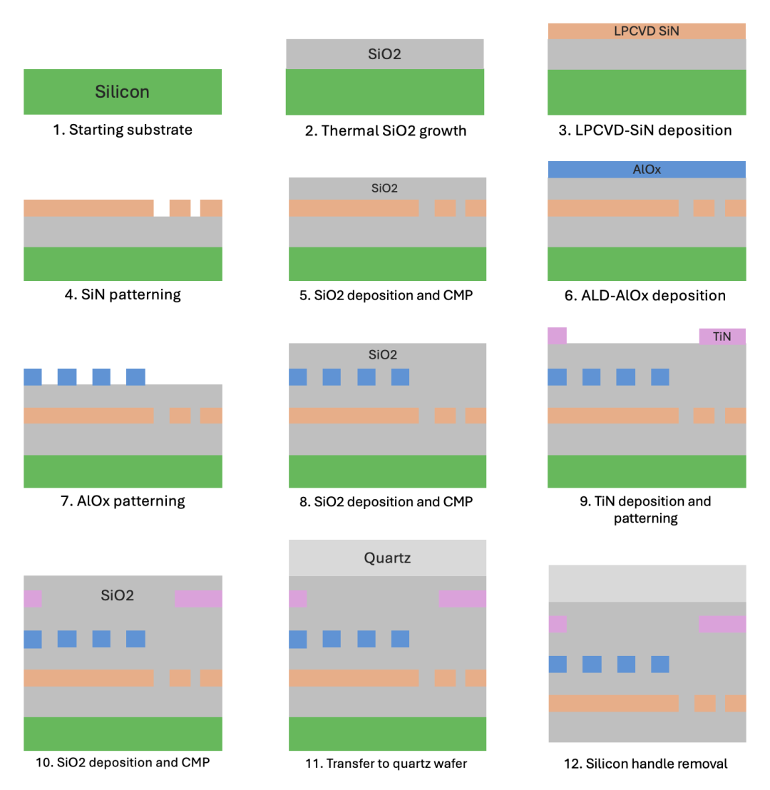 本工作采用的8英寸氮化硅波导平台,为在红(R)、绿(G)、蓝(B)可见光波段实现低损耗,选择50nm厚的SiN层作为波导——在器件紧凑性与散射损耗降低之间取得平衡(松散约束的光学模可减少散射损耗)。通过将SiN沉积工艺优化为轻微富氮状态,可将SiN的带隙进一步向蓝光波段偏移,在R、G、B 波长(635、520、450nm)的传输损耗分别只有 0.1dB/cm、0.3dB/cm 和 1.1dB/cm。
