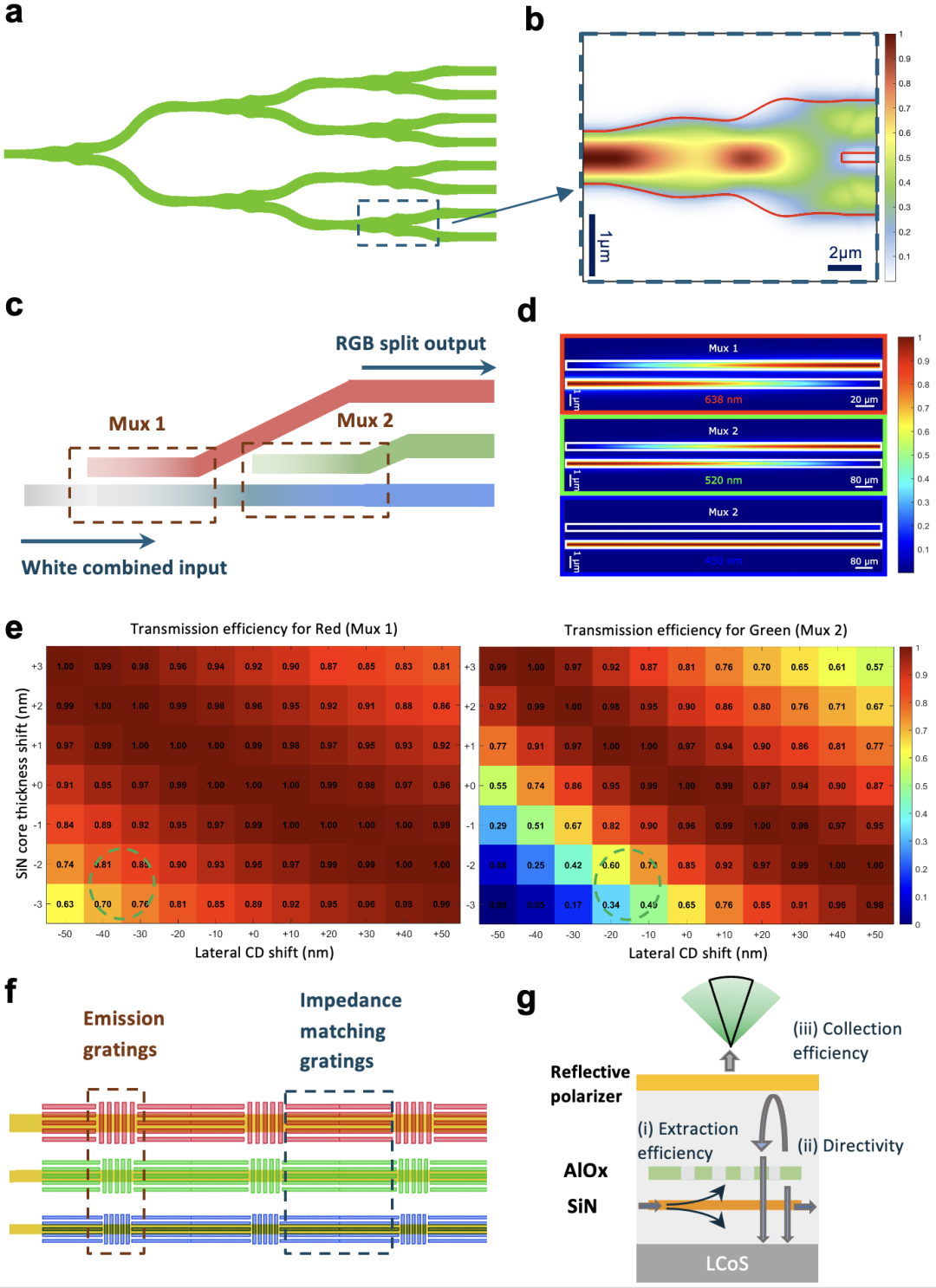 其中亮度均匀性和光提取效率之间的平衡是很重要的。光栅的提取效率越高,发光的均匀性就越低。为了克服这个问题,这里采用了双向输入的方式,如图 2c 所示,光在芯片上通过两组 Y 分束器从相反方向馈入。这产生了一种补偿效应,尽管在每个方向上是单调衰减,但相互补偿之后保持均匀照明(图 3a)。 通过优化每种颜色的 PIC 层堆叠和光栅强度来实现高颜色均匀性。根据玻恩近似,光栅的耦合效率与光栅结构处的模式强度成正比。因此,为了实现良好的颜色均匀性,需要匹配 R、G 和 B 的光栅效率,这反过来又需要设计它们的模式轮廓。为了实现这一点,这里使用三层 PIC 设计——光栅在SiN波导层上方还有一层氧化铝(AlOx)层图形,中间有一个二氧化硅(SiO₂)Spacer(图 2d、2e)。三层堆叠提供了更多的设计自由度,以根据波长定制模式和光栅相互作用。