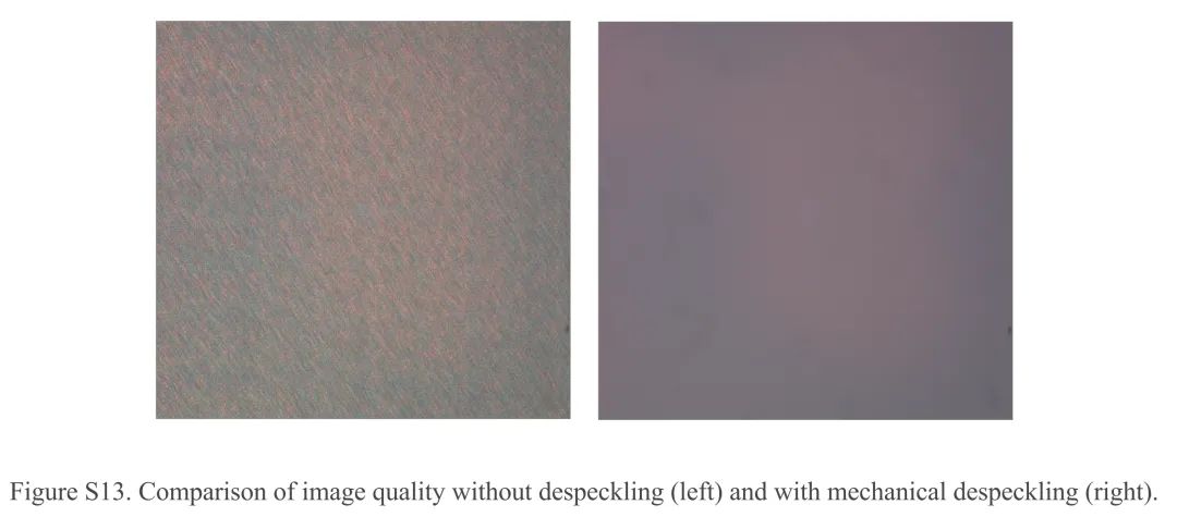 ◆ 本工作的不足与挑战 ① 激光散斑 实现 PIC 激光显示器仍面临几个挑战。首先是激光散斑。散斑是激光显示器中已知的问题。比如这里可以观察到它们在图像中表现为颗粒状图案,这是由于不同 PIC 发射器在 LCoS 平面上的干涉造成的。当前设备中没有实施额外的去斑方法,采用 1nm 带宽的单模激光测量到约 20%的散斑对比度,超过了典型的感知阈值 4%。在现有激光投影仪中已经提出并测试了多种缓解方法,如波长或偏振分集、动态漫射器和微透镜阵列。