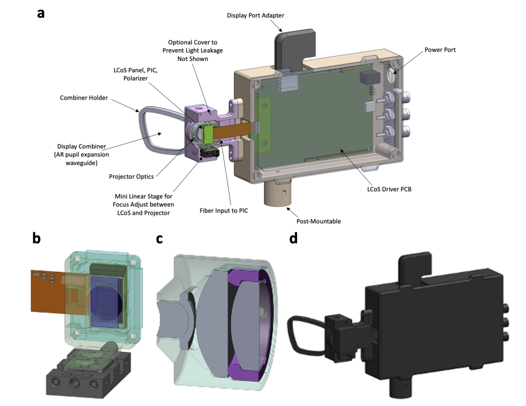 接下来评估了 PIC - LCoS 集成后的显示性能。图 4a 显示了一个具有紧凑外形和高亮度的全功能显示组件。这里使用的 LCoS 面板具有 4.5μm 的像素间距,FHD(1920×1080)分辨率,并以 120Hz 的视频帧率运行。