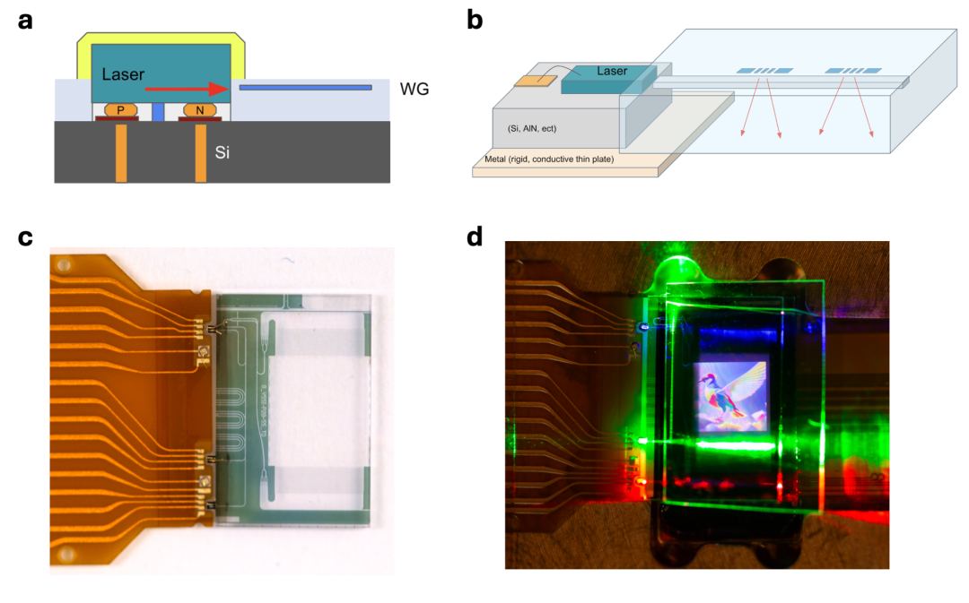 非自发光显示器中有三个关键模块:光源、照明单元和光调制器件,分别使用RGB激光器、PIC 照明器和 LCoS 显示面板(图 2a)来展示这个概念及其在 AR 眼镜中的应用。