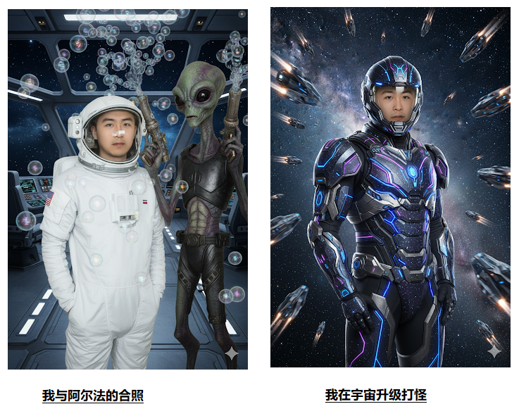 先让你上传一张自己的照片。然后摆出姿势,站在一个拿着两把泡泡枪、往空中吹出一千个泡泡的逼真外星人旁边,保持姿势和照片的拍摄地点不变。
