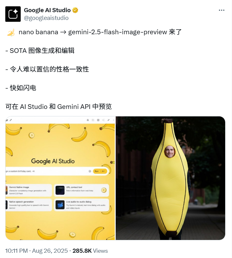 它的名字是 nano banana,Twitter 上甚至都换成了喜庆的香蕉色主题,AI Studio 的界面也跟着换上了“香蕉皮”配色。