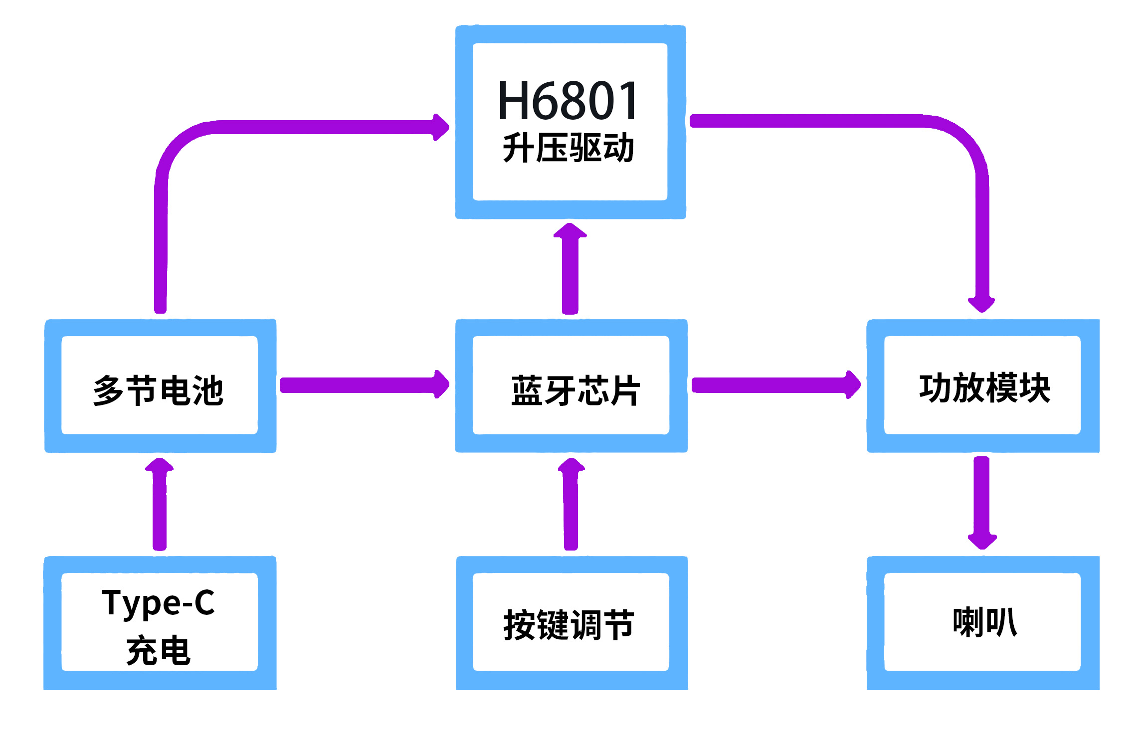 音箱放电内置H6801升压芯片进行电池升压给功放供电,将电源电压升高到功放芯片所需的电压,以提供足够的功率输出。