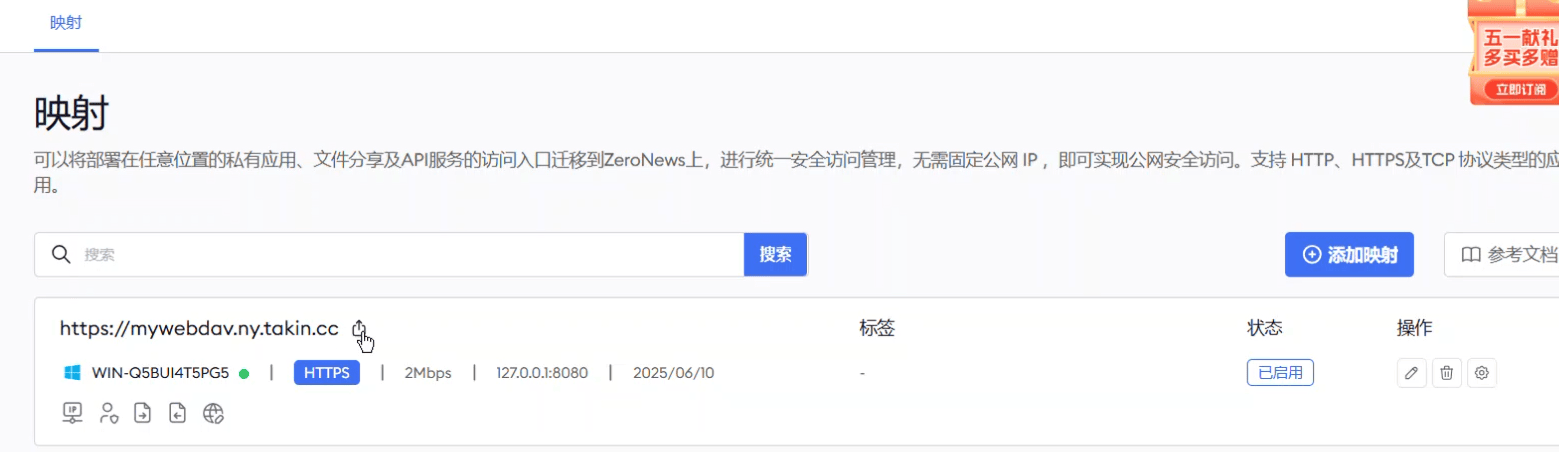 完成映射信息填写后,ZeroNews 将生成一个外网访问地址。这个地址将用于后续的磁盘映射,实现外网对WebDAV服务的访问。