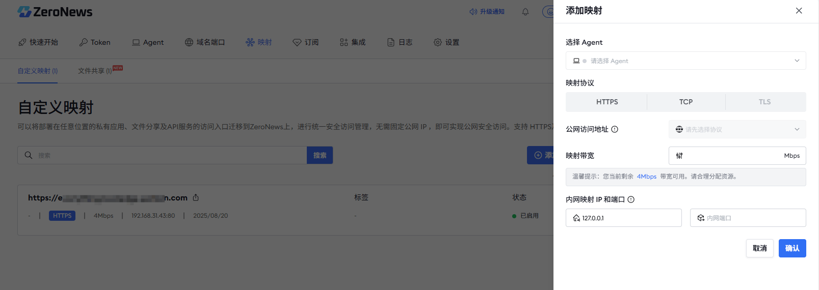 在ZeroNews管理平台,填写域名及端口,新增映射信息,包括映射名称、内网地址、内网端口等。