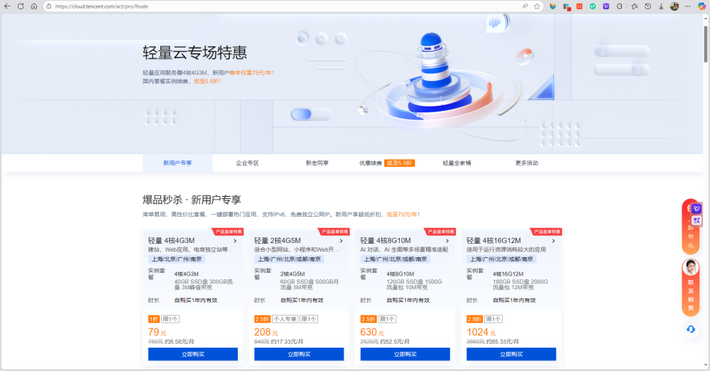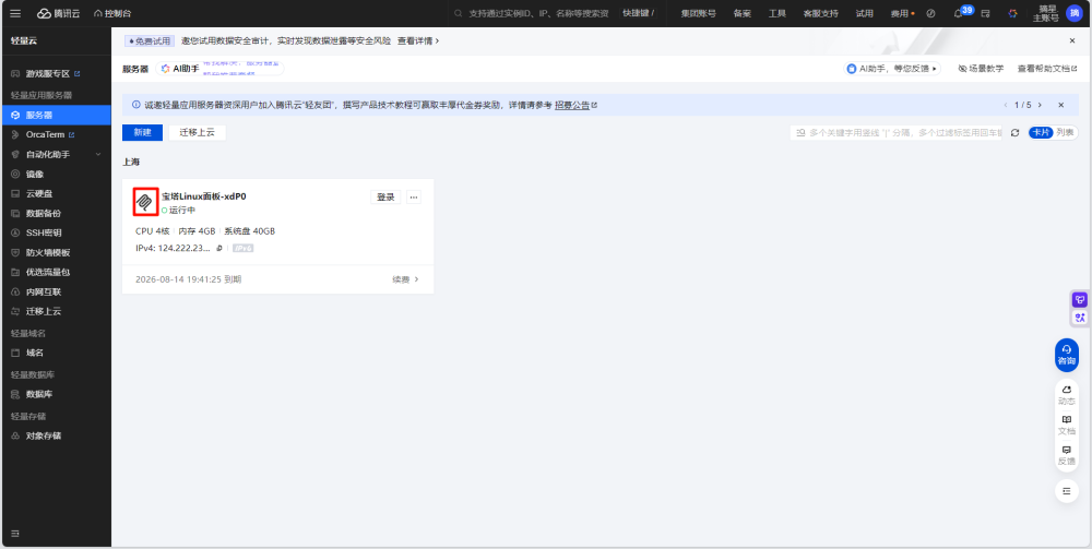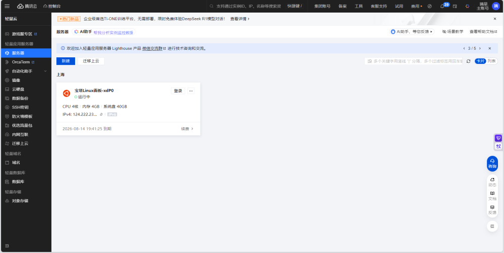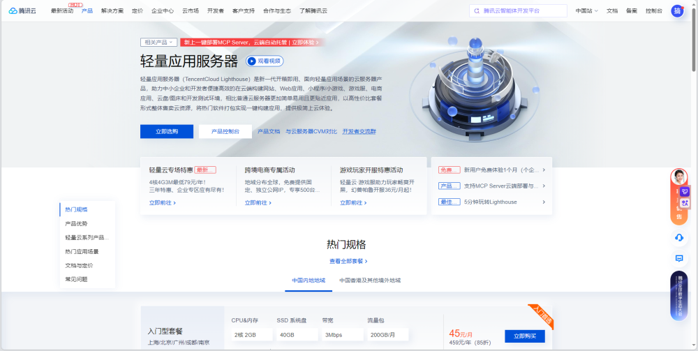 对于新手用户,可以先来到Lighthouse产品页购买一台新客活动4核4G一年版本,或者按自己需求进行选购配置,完成后即可获得自己的MCP Server应用实例。