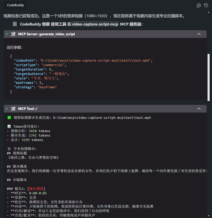 ✅ 功能丰富:热门视频拍摄脚本MCP 是一个专业的视频分析和脚本生成工具,通过 MCP 协议为 AI 助手提供强大的视频处理能力。它可以从热门视频中提取关键帧,使用腾讯混元多模态 API 进行智能内容分析,并生成专业的拍摄脚本,帮助创作者快速理解视频内容并制作类似的热门内容。
