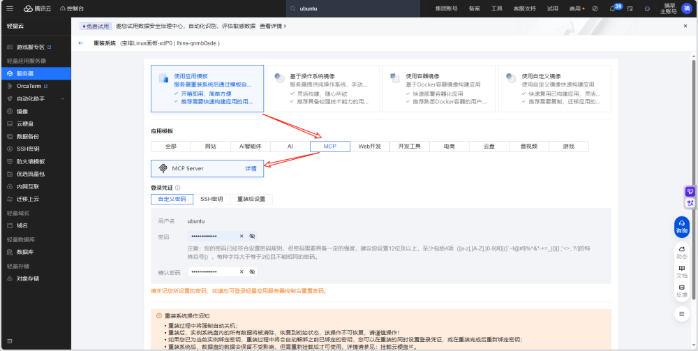 方式二:【免费】将已有服务器重装系统为MCP Server,确认后相关信息后,稍等片刻等待即可自动重装完成。