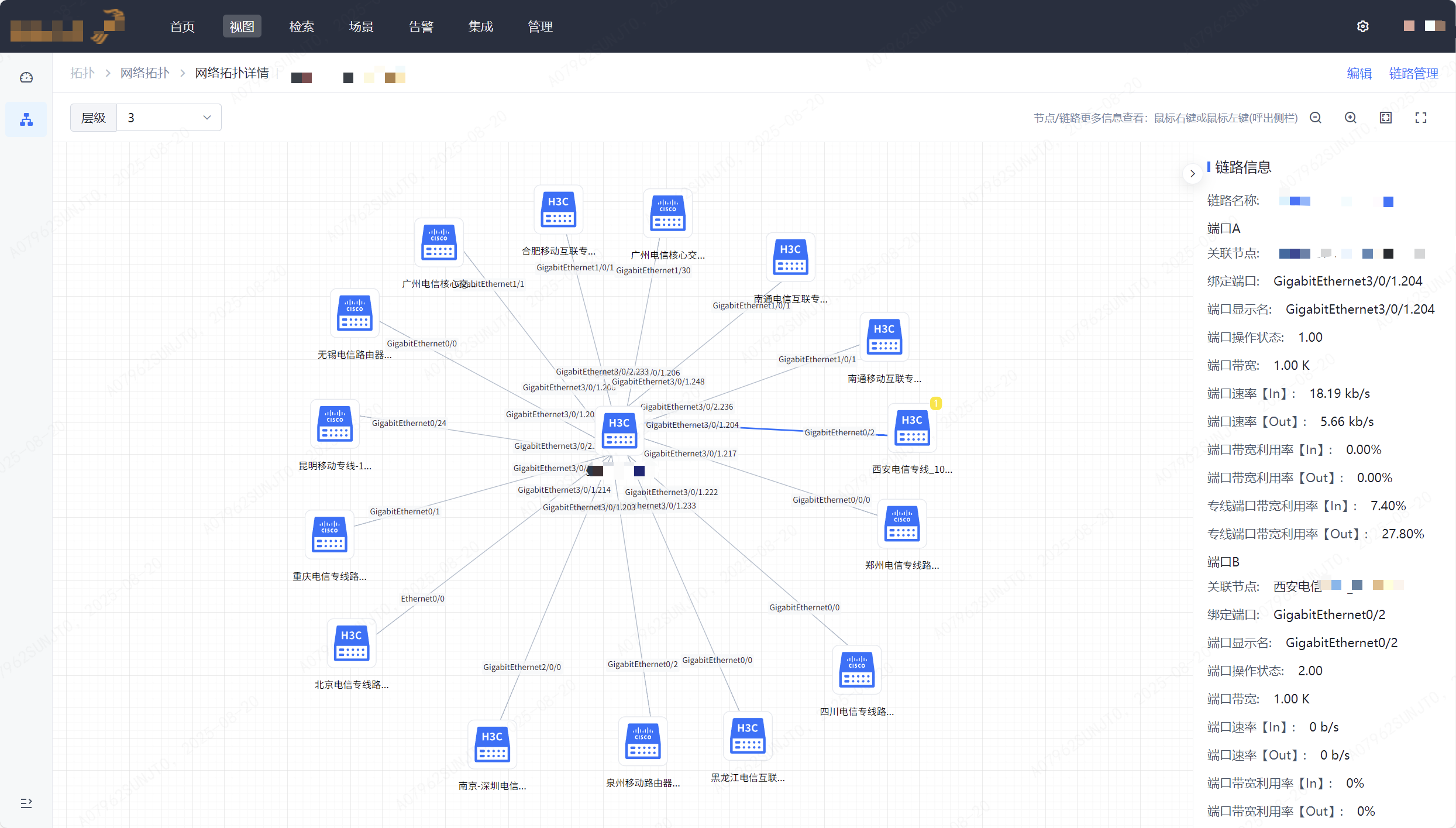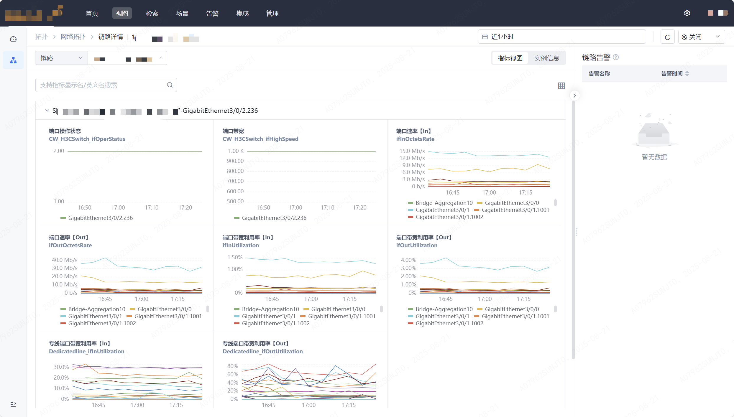 全面监控网络链路的运行状态,包括端口状态、带宽、速率、带宽利用率等关键指标;通过拓扑图直观展示链路连接关系与关键实时数据。支持链路信息查询、指标趋势分析及告警关联,可及时发现链路拥堵、中断等问题,保障网络传输通畅,为业务数据流转提供稳定支撑。