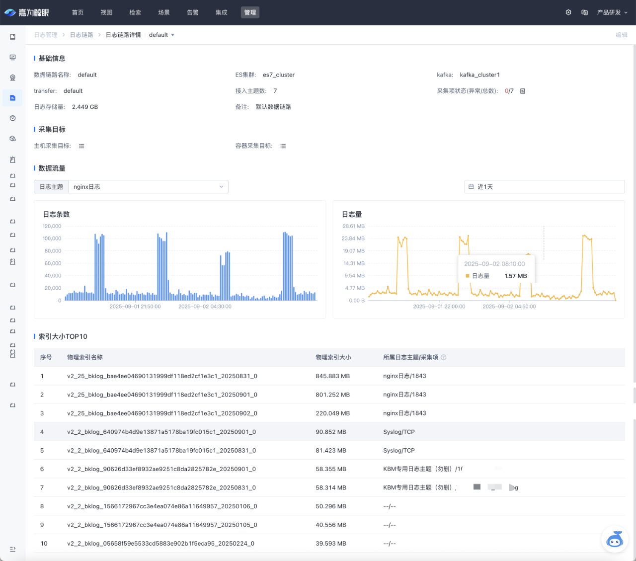 日志采集链路的资源使用情况以可视化方式直观呈现,数据链路上的组件资源容量分析、控制调优都能轻松搞定,让资源管理更清晰、更高效!