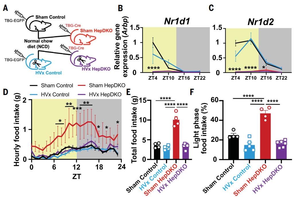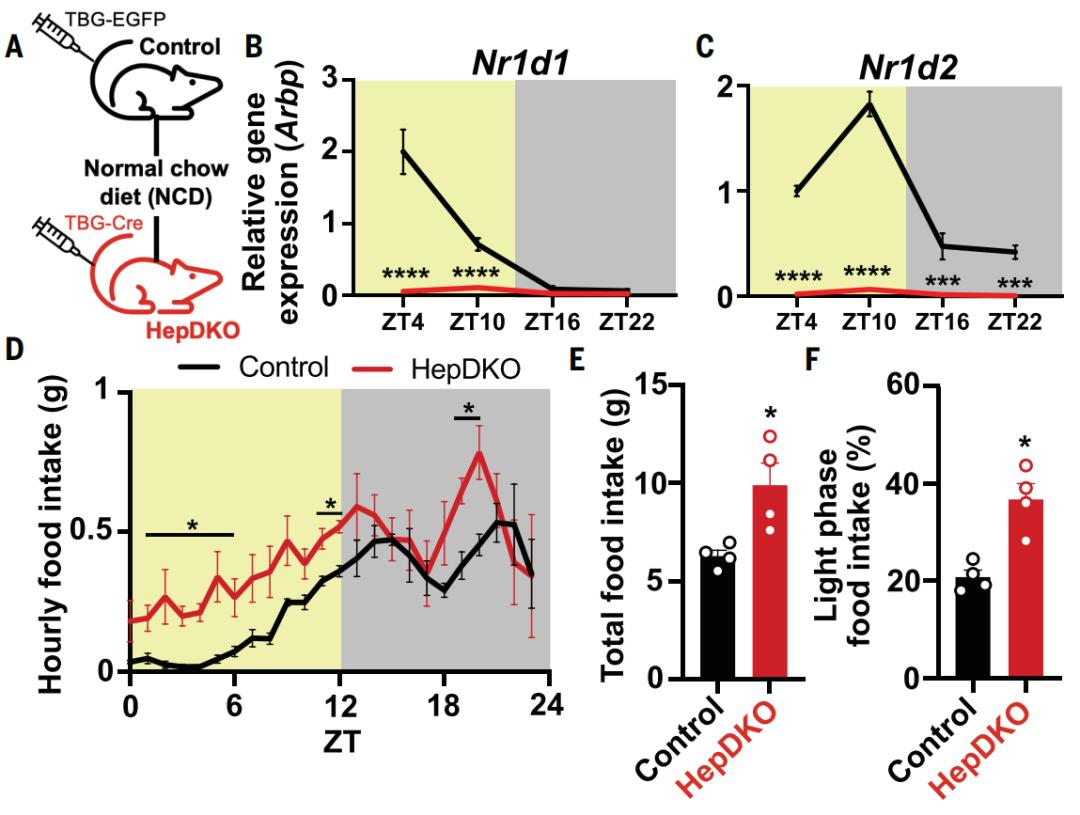 在这项研究中,Mitchell A. Lazar等人通过在成年小鼠肝细胞中特异性删除昼夜节律调节基因REV-ERBa、REV-ERBb,构建了肝脏分子钟紊乱的小鼠模型(HepDKO)。他们打算通过让肝脏与大脑的生物钟“错位”,来找出昼夜节律紊乱对饮食行为的调控机制。