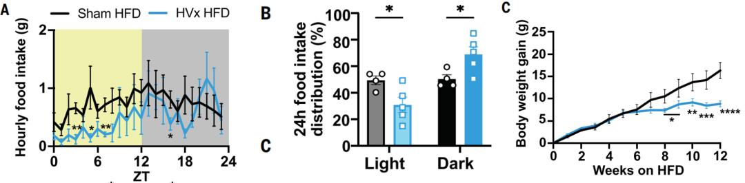 之前的研究表明,高脂饮食(HFD)小鼠或饮食诱发的肥胖症小鼠会在光照期间摄入更多食物,并且肝脏分子时钟受到破坏。此次研究者们发现,与假手术对照组相比,接受肝迷走神经切断术的小鼠在12周的高脂饮食喂养下体重增加更少,食量减少、耗氧量增加、活动量增加。