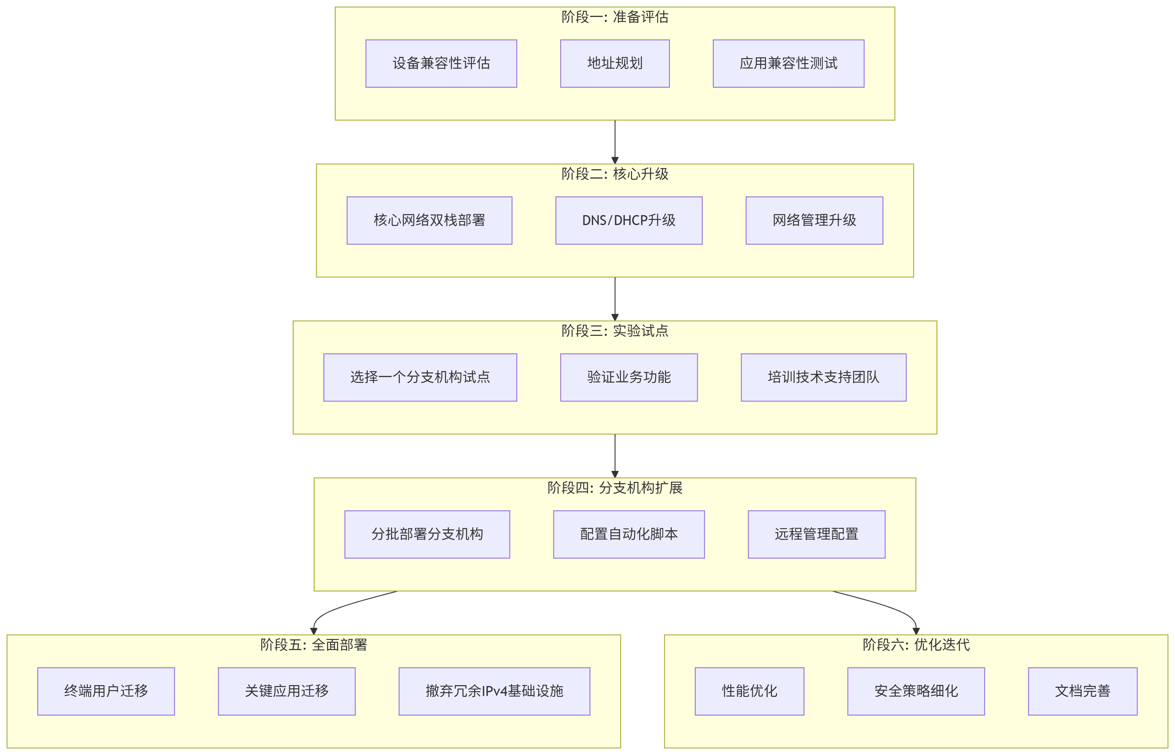 IPv4向IPv6的迁移是一个渐进的过程,需要周密的计划和执行。采用双栈技术作为基础,结合隧道和协议转换技术,可以在保证业务连续性的前提下实现平滑过渡。同时,IPv6环境下的安全性和可管理性需要特别关注,必须同步更新安全策略和管理流程。
