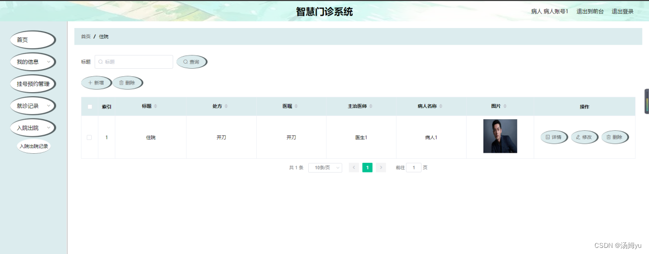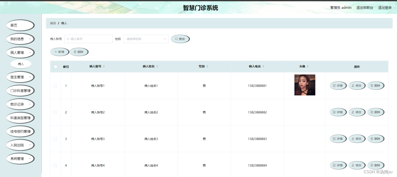 (1)患者信息管理:患者可在平台注册,修改信息。查看医务人员的相关信息和医院各门诊挂号情况,决定取挂号的时间与医生,随时与医务人员线上沟通。