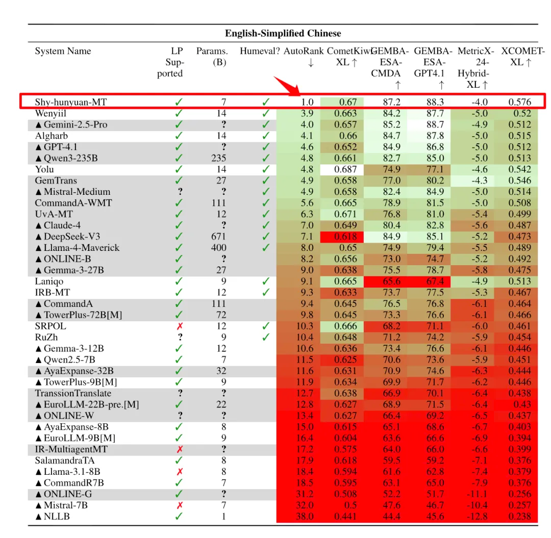 在8月底结束的国际计算语言学协会(ACL)WMT2025比赛中,腾讯混元Hunyuan-MT-7B(参赛名称:Shy-hunyuan-MT)拿下了全部 31个语种比赛中的30个第1名,处于绝对领先地位。