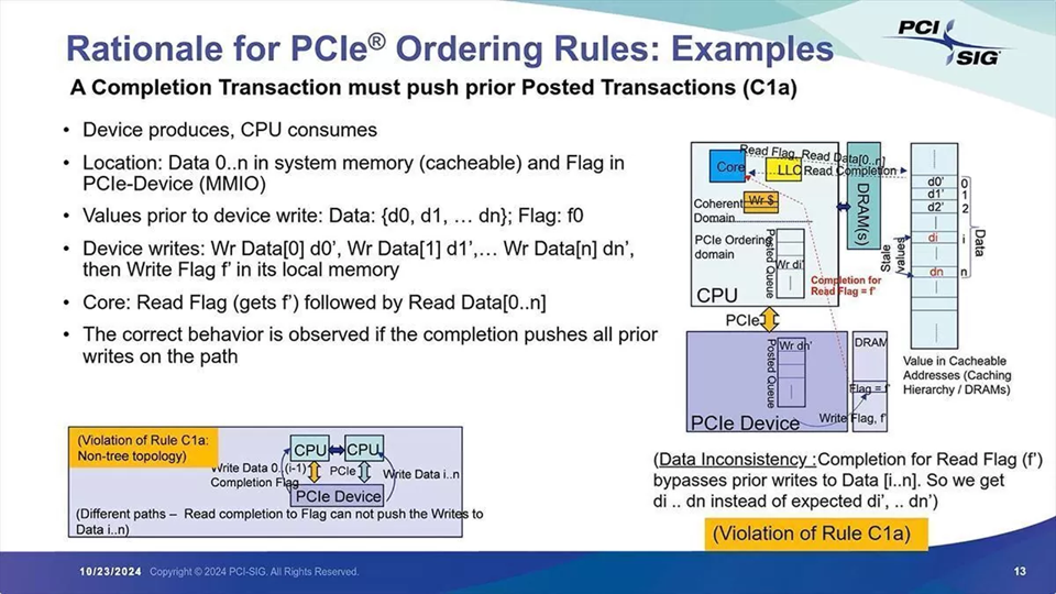 图 7:在 PCI Express 设备向 CPU 传输时,CPU 向内存写入数据后,必须 “随后” 写入 Write flag f。但实际上,由于缓存的存在,顺序可能会颠倒,而这属于违规行为