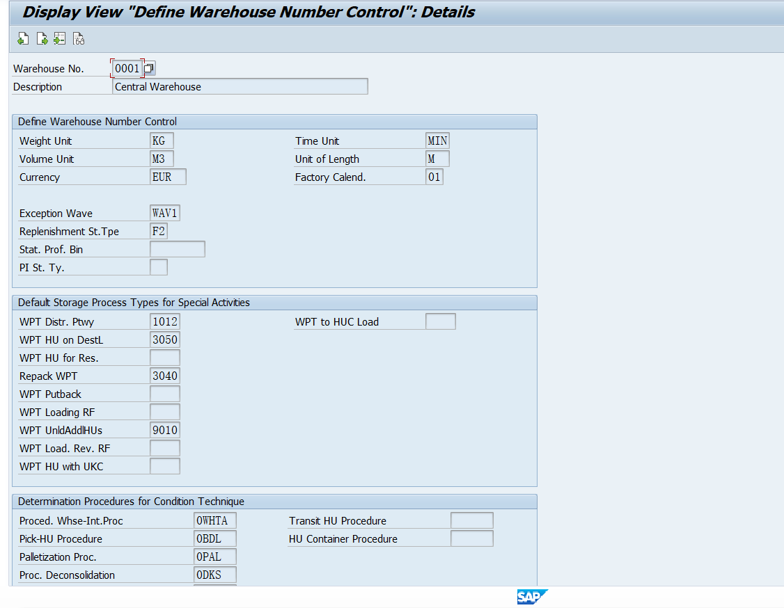 除了定义该仓库号下各种最基本的计量单位,比如重量单位,体积单位,时间单位,长度单位,货币单位以外,还预定义了工厂日历,以及一些特殊Activities的缺省WPT。