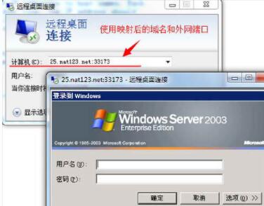 在外地电脑或设备,打开远程桌面连接界面时,输入使用对应的外网域名端口地址(域名端口中间英文输入冒号)即可,然后对应填写目标计算机帐号密码登录进行远程桌面连接控制使用,就像是本地电脑操作一样。