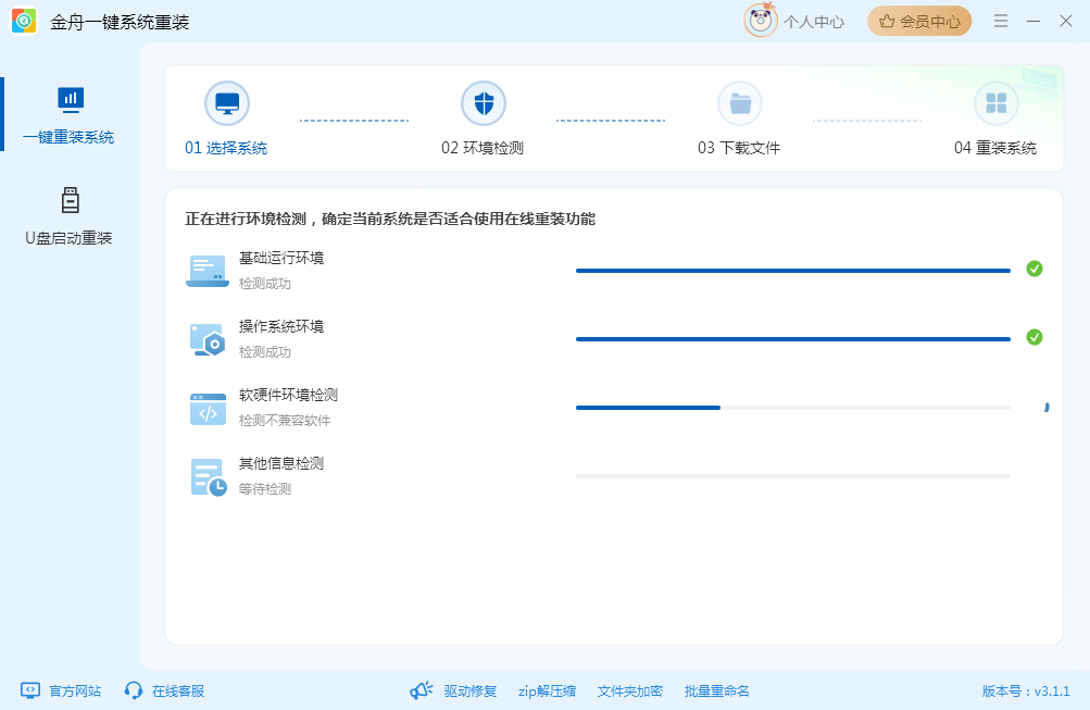 ✅零基础操作:操作简单,3步完成重装(环境检测-文件准备-自动重启)