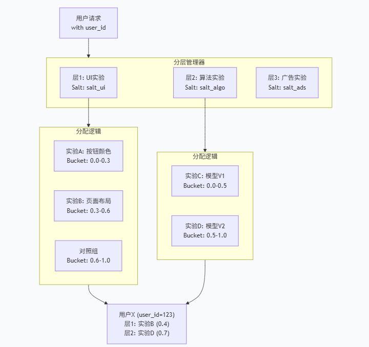 对总是产生相同的哈希值,进而产生相同的分组结果。在实际业务中,我们永远不会只同时运行一个实验。市场部想测试广告文案,产品团队想测试新功能,算法团队想测试新模型。如果他们都在争抢那点宝贵的流量,我们该如何管理?