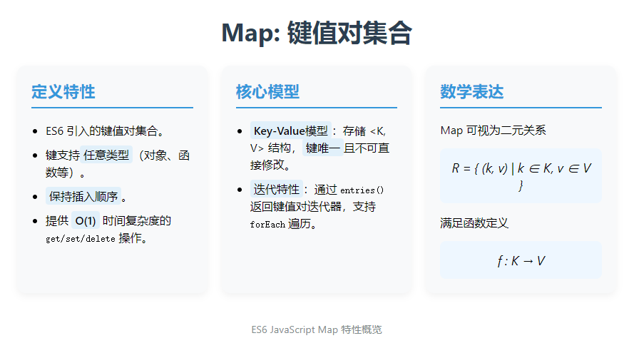 <K,V>结构,键唯一且不可直接修改entries()返回键值对迭代器,支持forEach遍历数学表达:Map可视为二元关系R={(k,v)|k∈K,v∈V},满足函数定义f:K→V