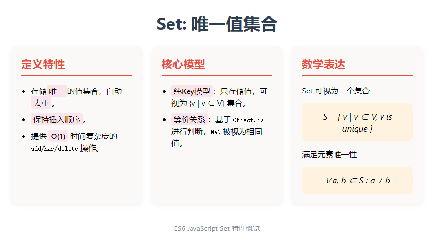 定义特性:Set是唯一值集合,值自动去重,保持插入顺序,提供O(1)时间复杂度的add/has/delete操作。