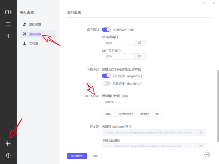 如果要下载某网盘的资源,可以在软件的设置里的“进阶设置”中,进行配置U.A。