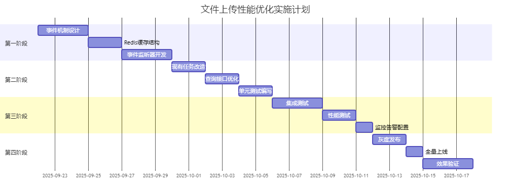 ①基础准备:Redis配置、线程池配置 ②核心开发:FileCheckCacheManager、事件机制 ③接口改造:查询接口优化 ④测试验证:功能测试、性能测试