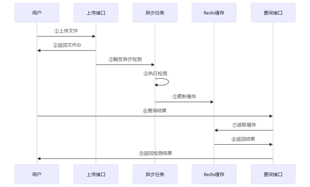 文件上传 → 立即返回ID → 异步检测 → 更新缓存 → 查询缓存