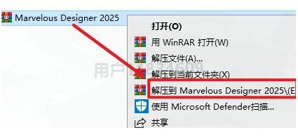 - 找到下载好的压缩包,右键点击选择解压到"Marvelous Designer 2025"。没有解压选项的话可能需要安装解压软件。