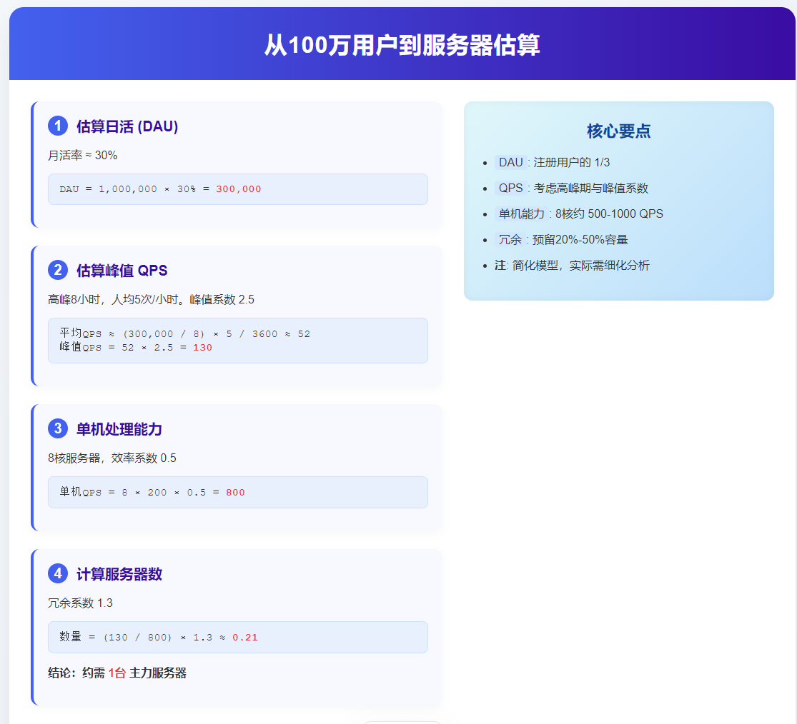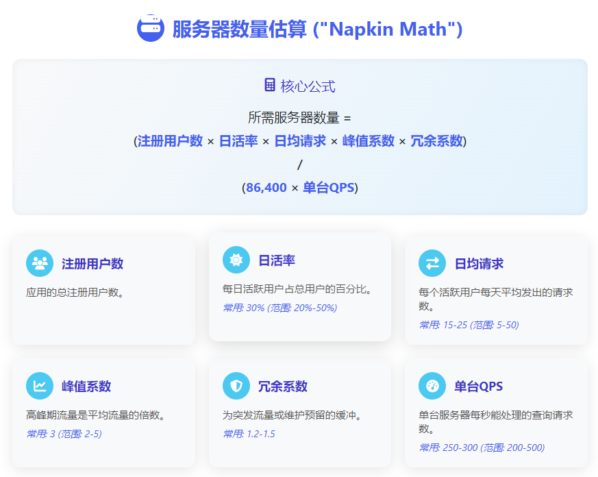 所需服务器数量 = (注册用户数 × 日活率 × 日均请求次数 × 峰值系数 × 冗余系数) / (86,400 × 每台服务器QPS)