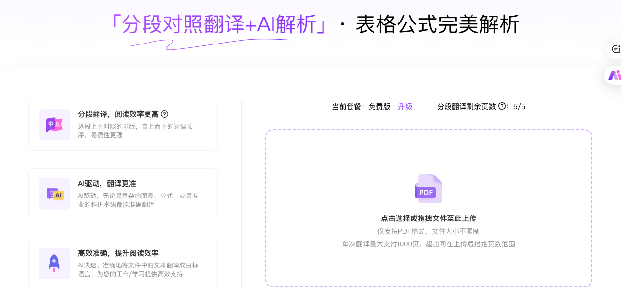会译的PDF翻译功能实现了"真免费":无文件大小限制、无字符数约束、无功能阉割,用户可免费享受包括AI总结重点在内的全部高级功能。这在当前市场中极具竞争力,尤其对需要处理大篇幅论文的学生和中小企业用户非常友好。