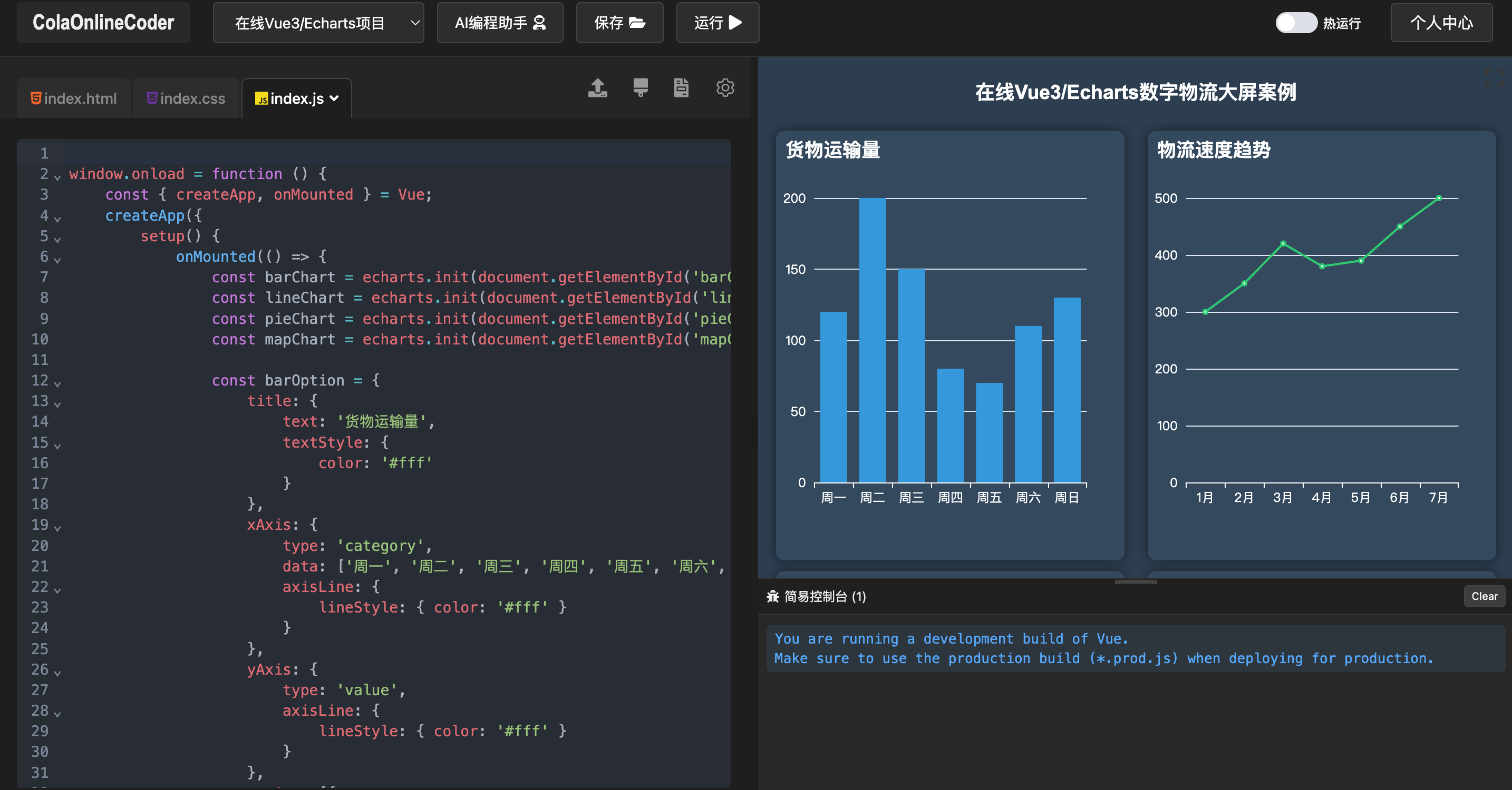 这个在线前端编辑器(ColaOnlineCoder)是一个基于Vue 3 + TypeScript构建的现代化开发平台,集成了CodeMirror 6编辑器、AI智能补全、多项目模板支持等核心功能。它为用户提供了从项目创建到代码调试的完整开发体验。