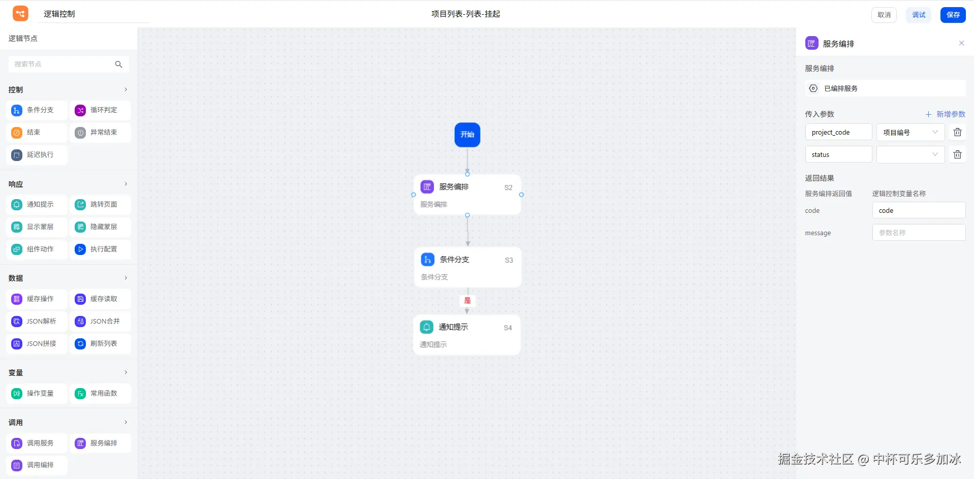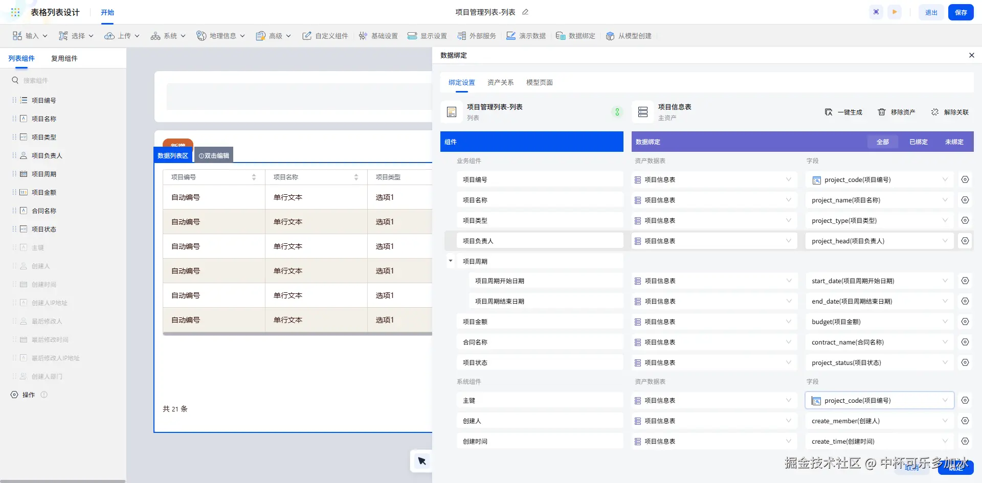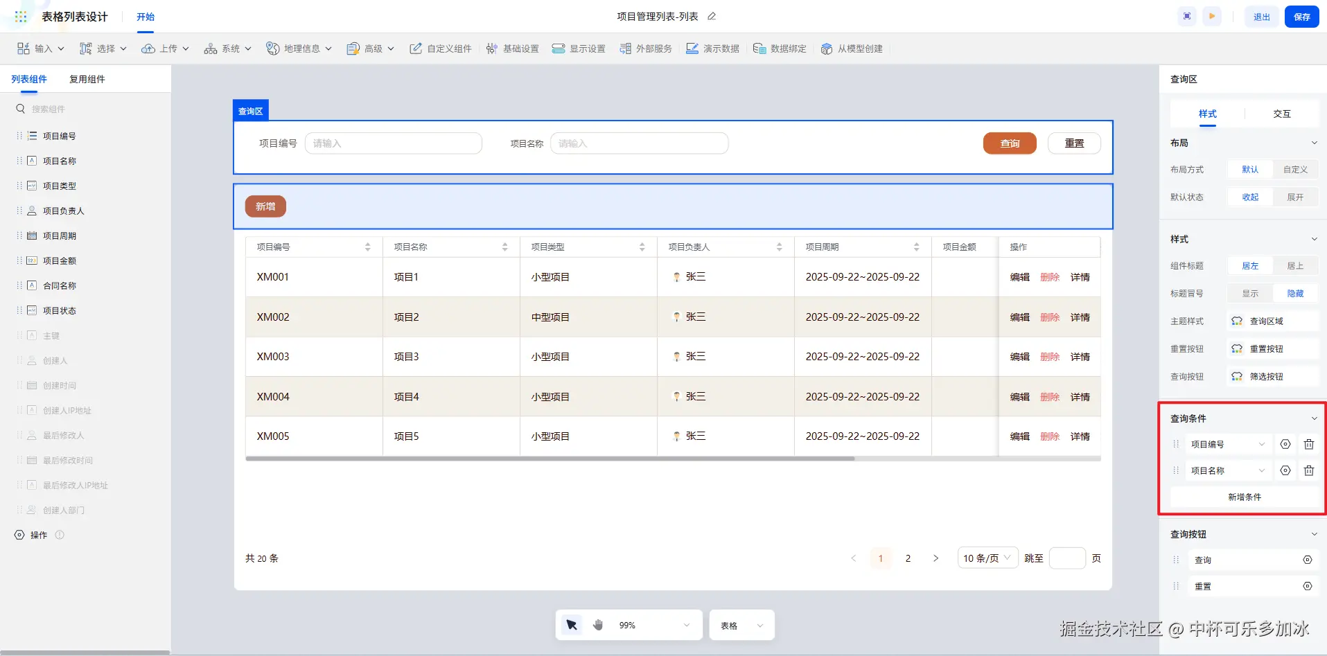 列表的查询功能配置同样简单高效,只需在查询区配置相关字段(如项目编号、名称)即可实现。