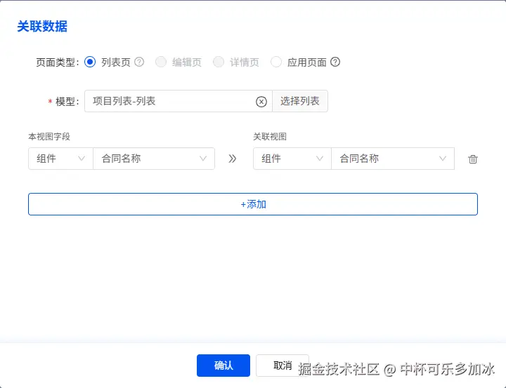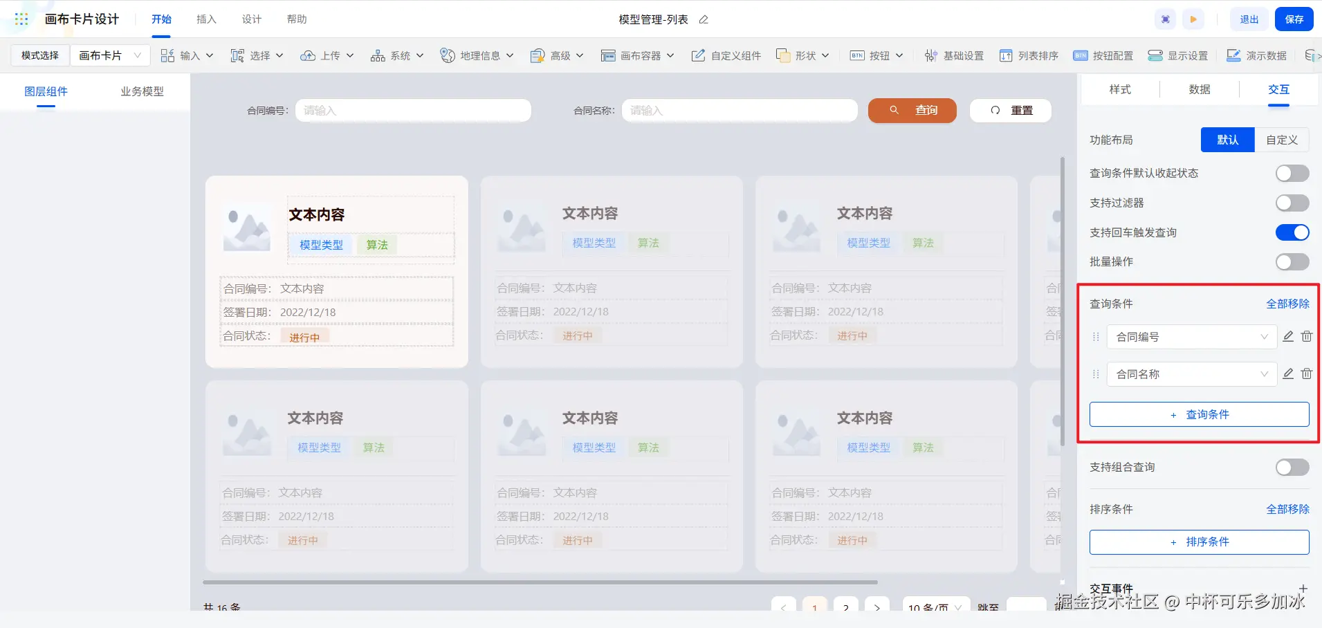 画布列表的查询功能同样是在“交互”一栏中配置,新增“合同编号”和“合同名称”作为查询条件。