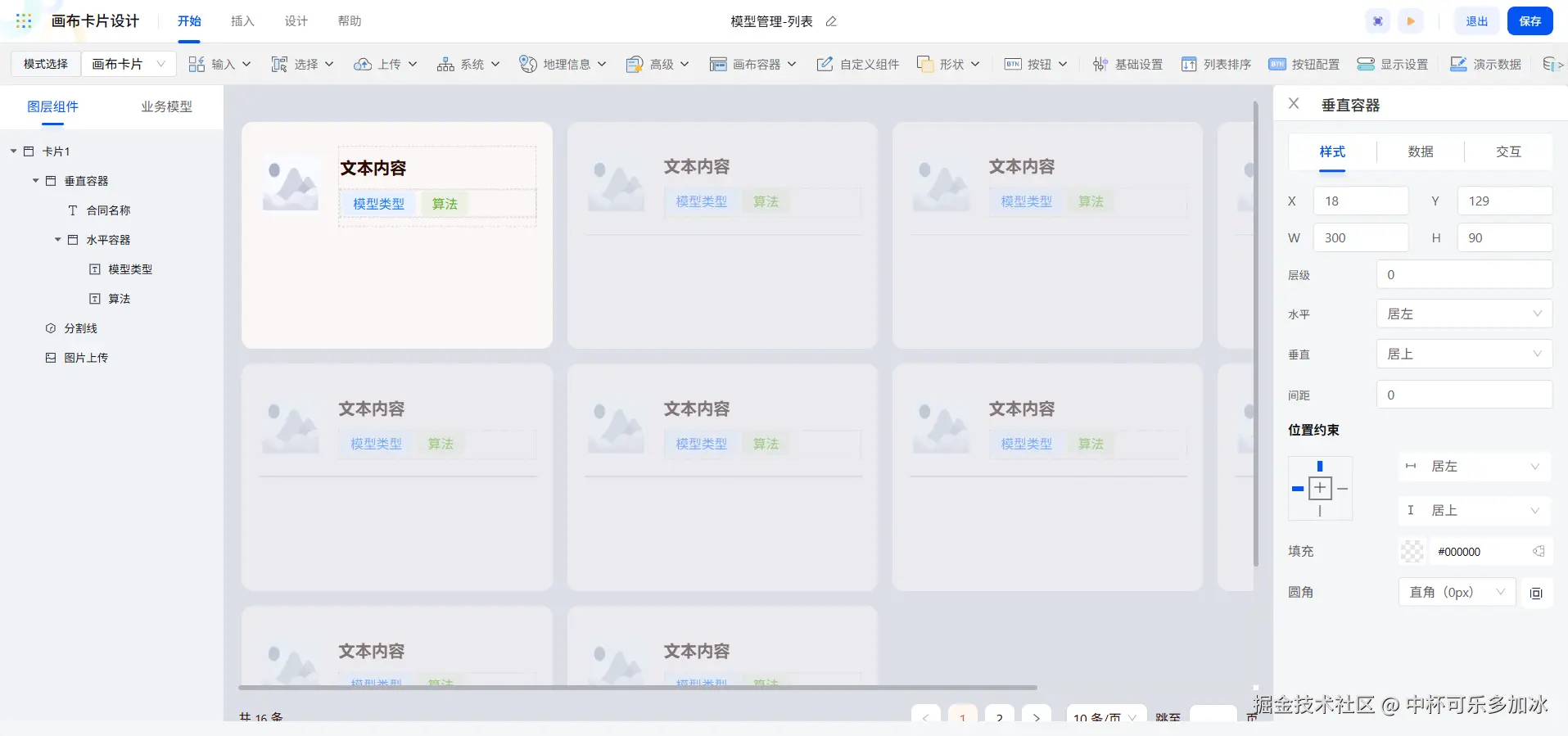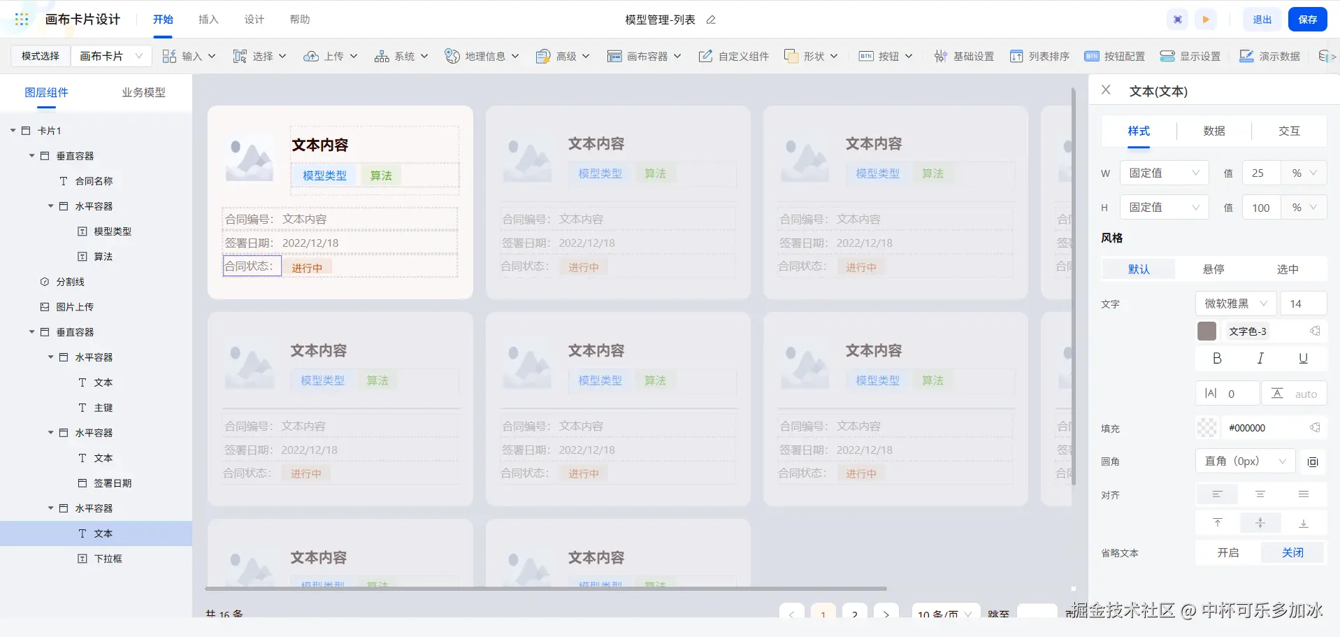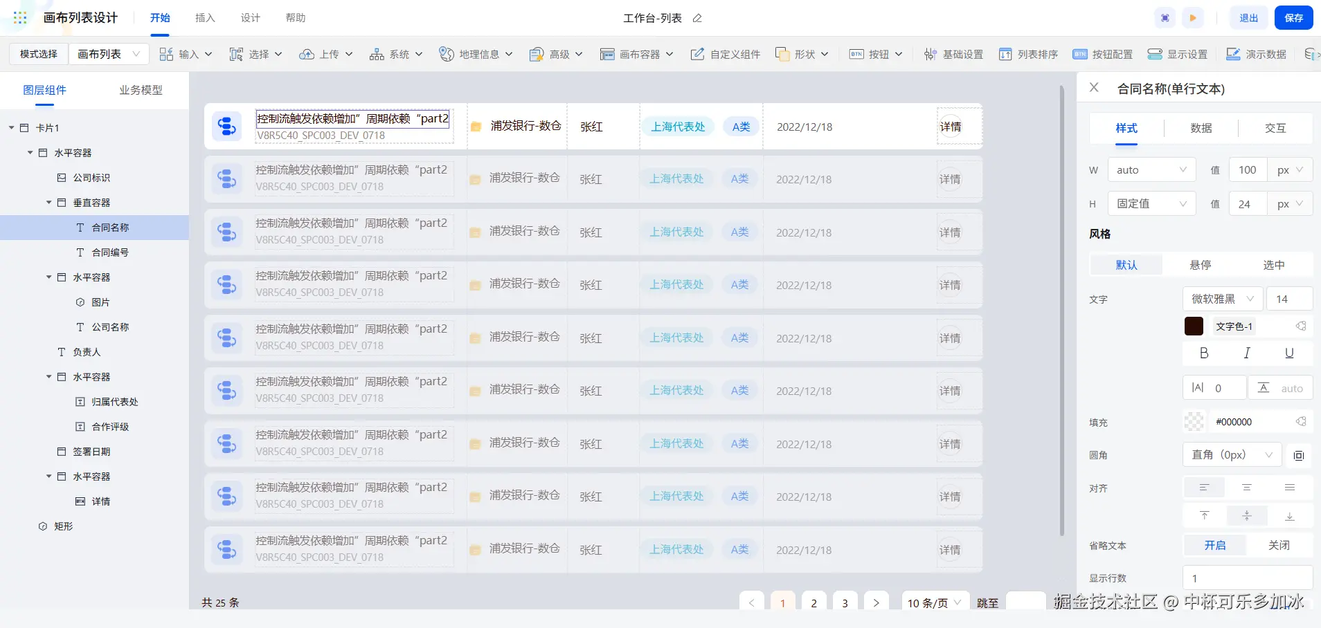 除了画布卡片,画布列表也可以实现组件的自由布局,我们可以利用画布列表配置工作台页面中合同信息的展示。画布列表配置逻辑与画布卡片是相同的,同样是拖入容器辅助布局,再插入所需组件调整样式,最后再进行数据绑定即可。