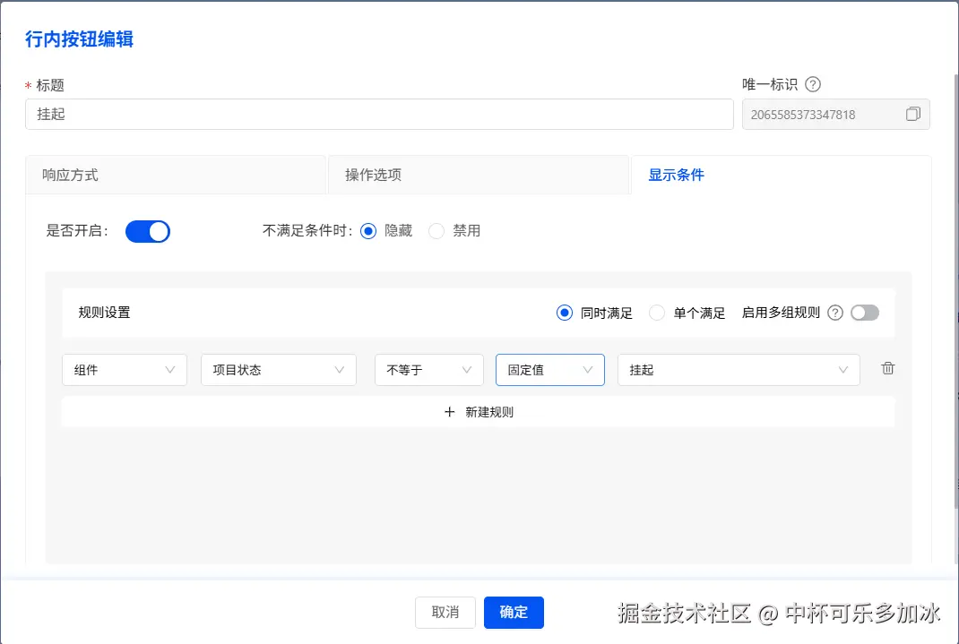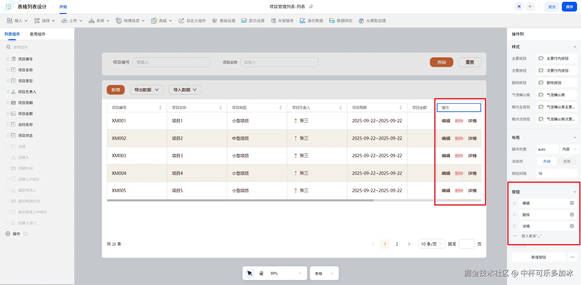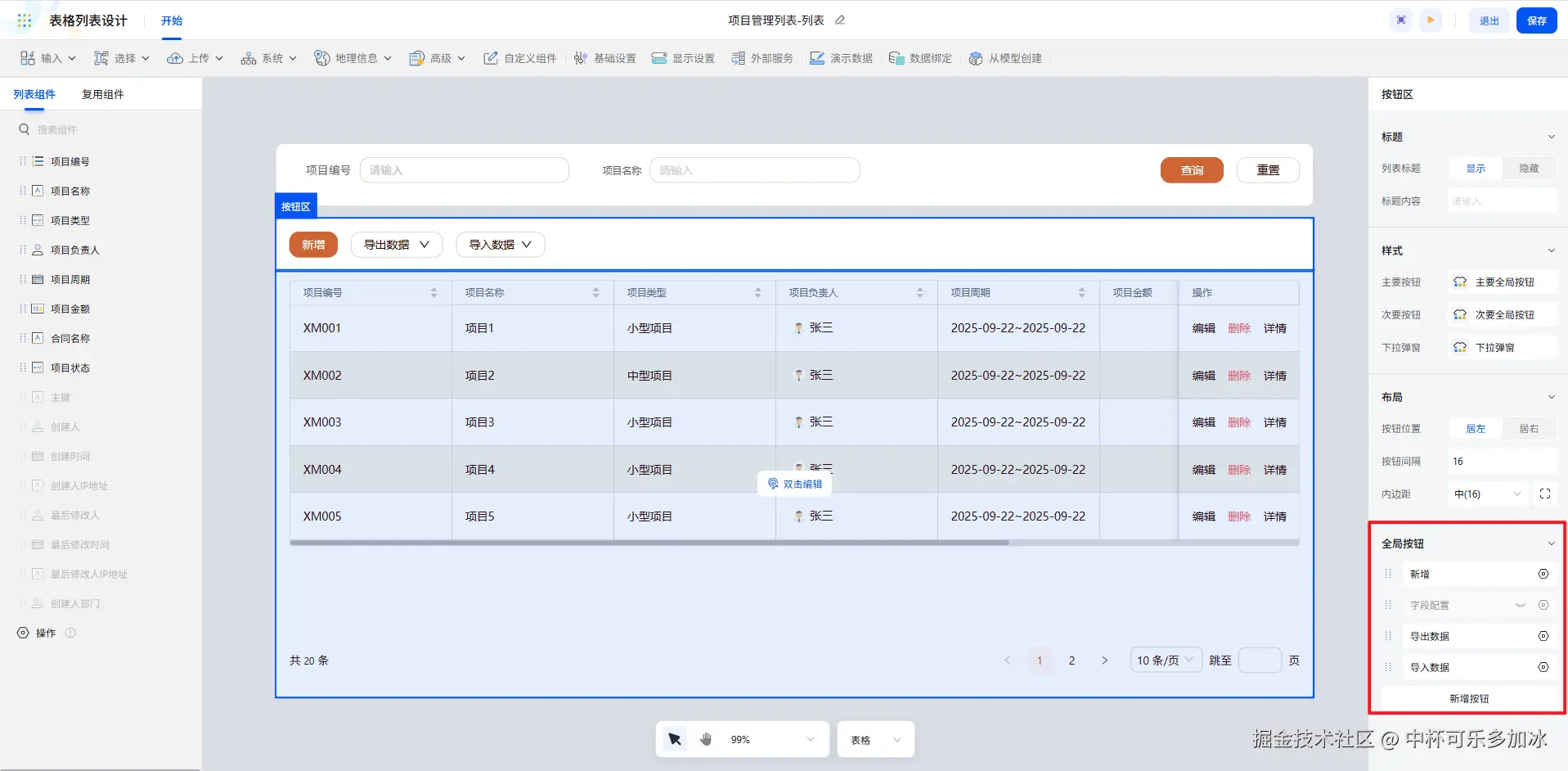 在按钮区,我们可以对列表的全局按钮进行配置。“新增” 按钮绑定表单,方便录入新的项目数据;开启” 导入 / 导出 “按钮,实现批量导入导出数据的操作,满足了大规模数据处理的需求,无论是从外部系统导入历史数据,还是将当前列表数据导出进行备份或进一步分析,都能轻松完成。