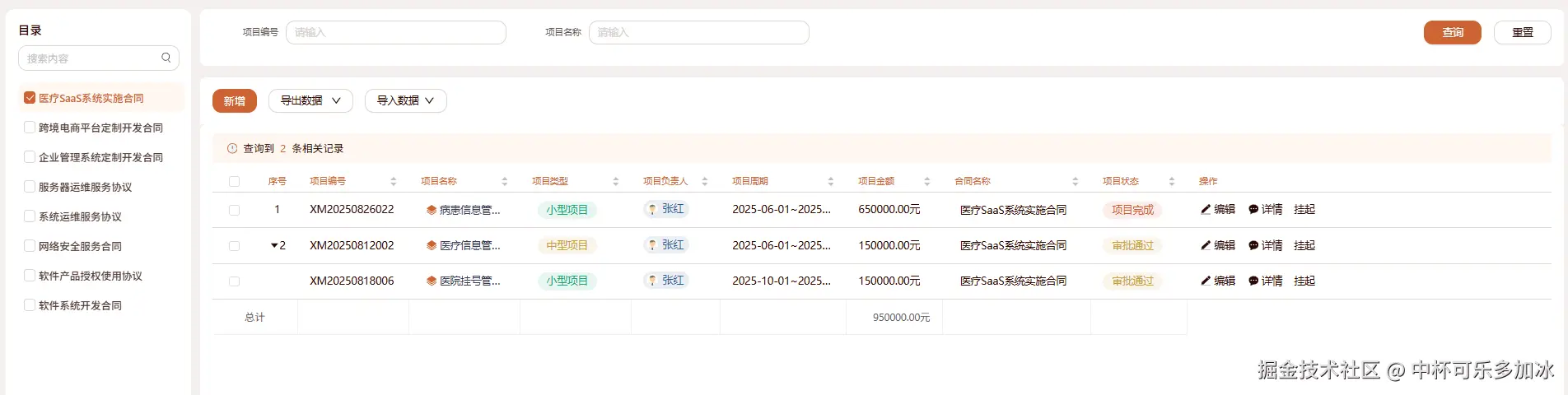 为了实现更高效的数据检索,我们选用列表目录组件来搭建项目信息的目录。通过在目录中展示合同名称,能够方便我们快速筛选和定位目标合同,并查看合同对应的项目信息。