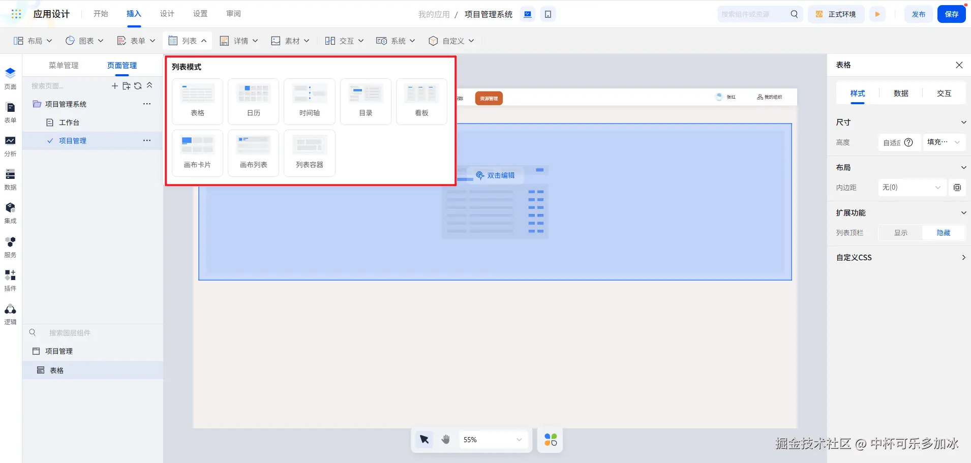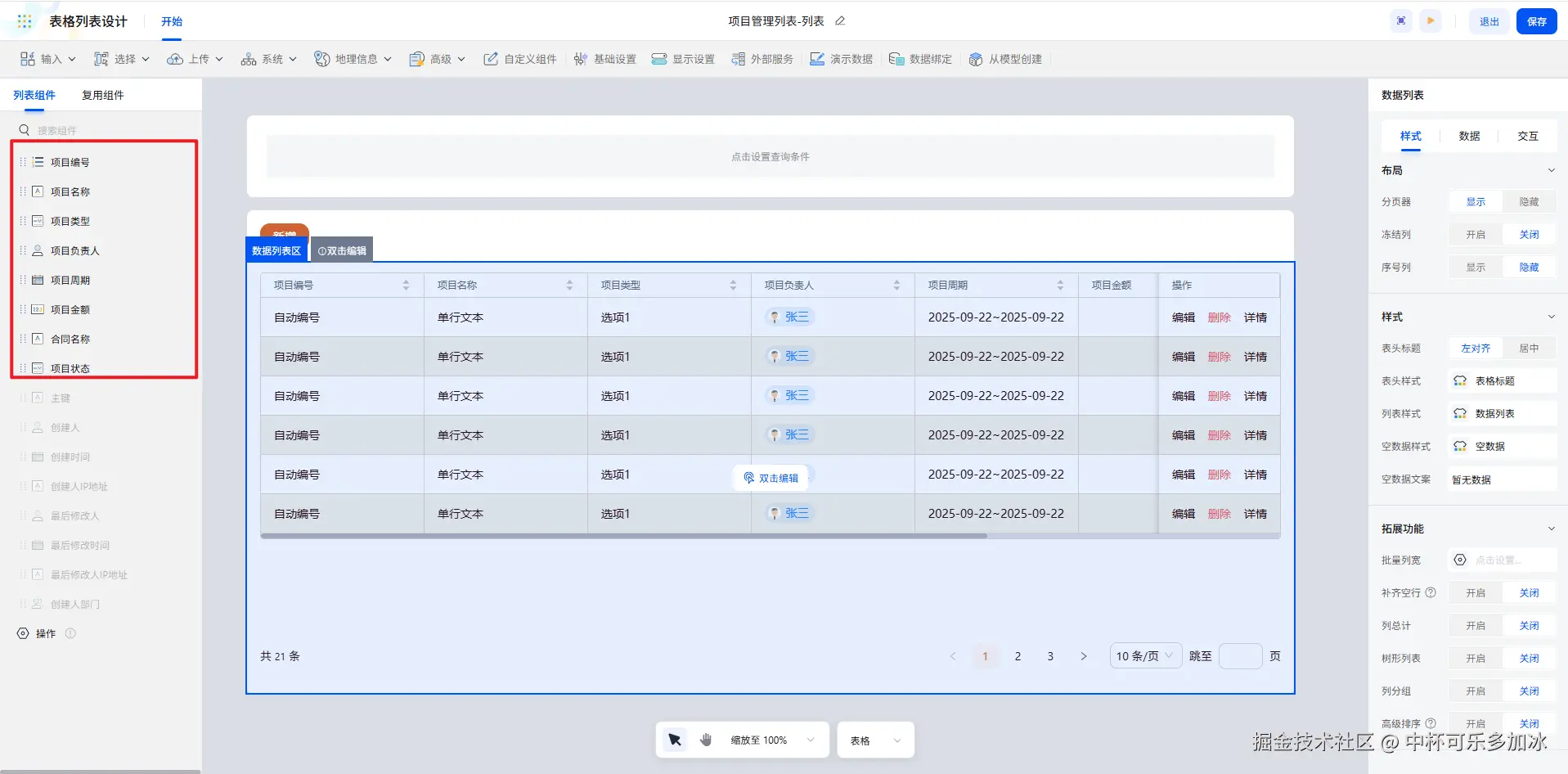 我们选用列表表格组件来搭建项目信息列表,它提供了输入、选择、上传等多种类型的组件,能满足多种列表字段的配置需求。