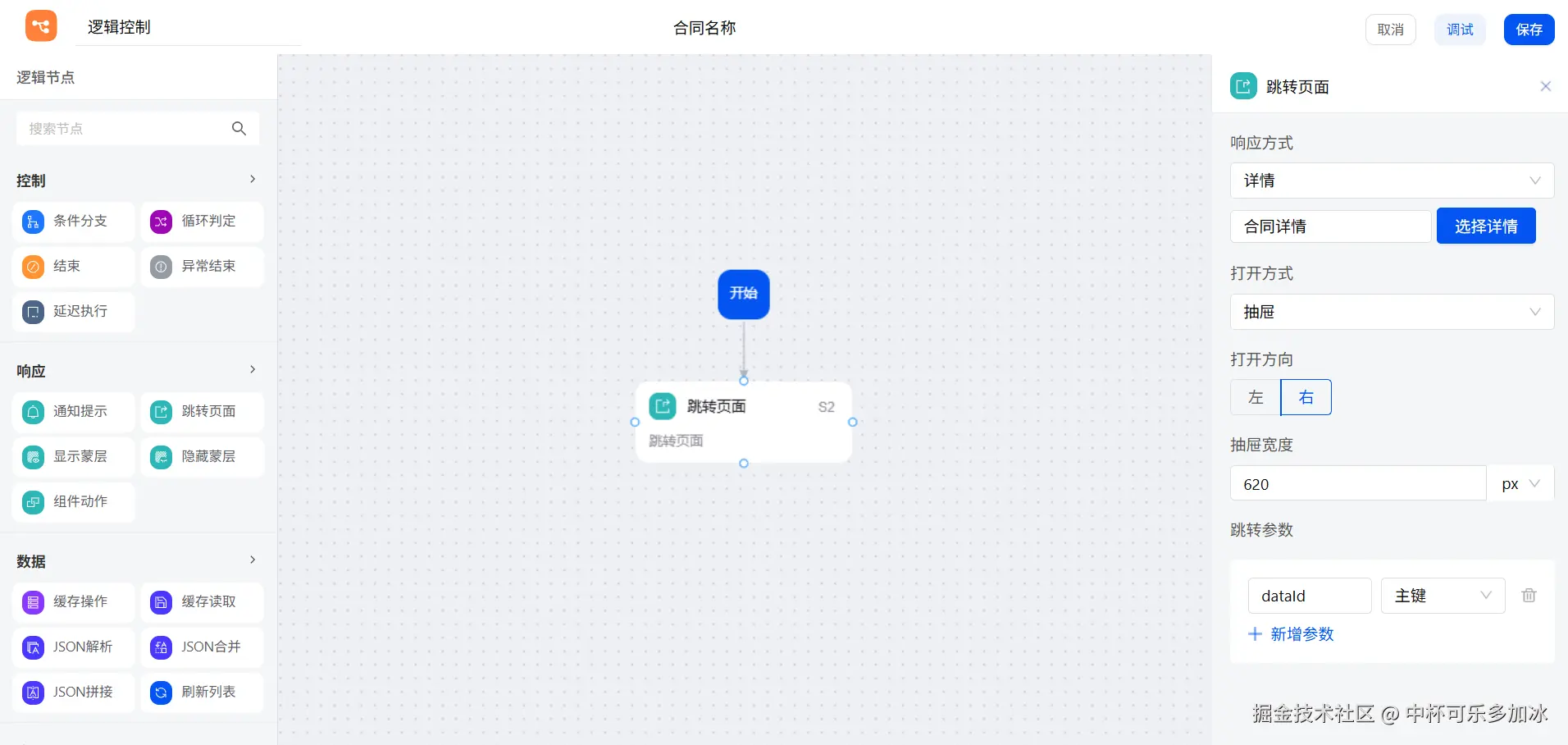 最后,在画布卡片交互方面,我们需要实现点击合同名称,跳转到合同详情页面的功能,只需选中组件,新增点击事件即可。在逻辑控制中,我们通过跳转页面节点,抽屉打开合同的详情页面。