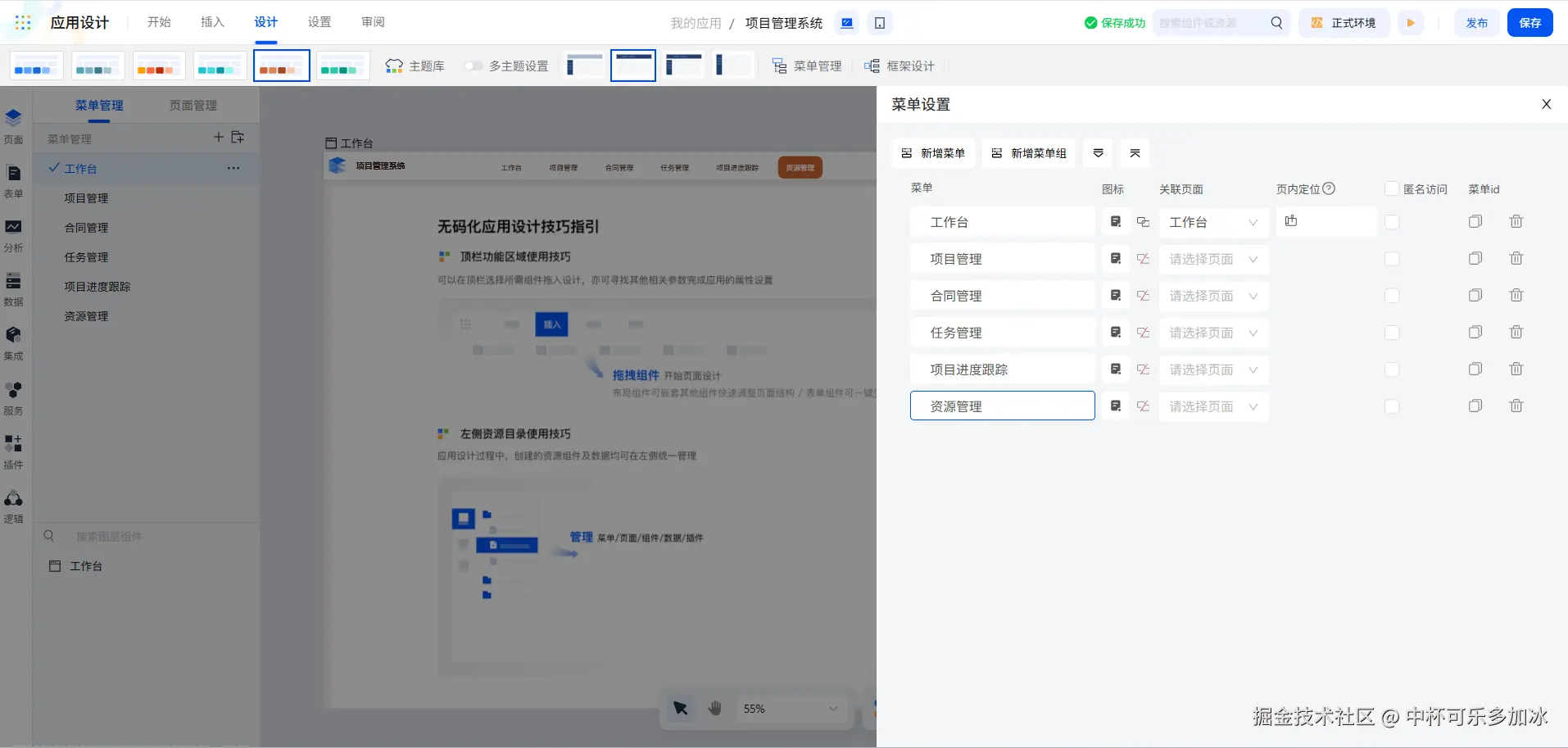登录 smardaten 平台后,首先新增应用,进入应用配置页。完成应用的基础设置、主题、导航、菜单等相关信息的配置,搭建应用的基础框架。