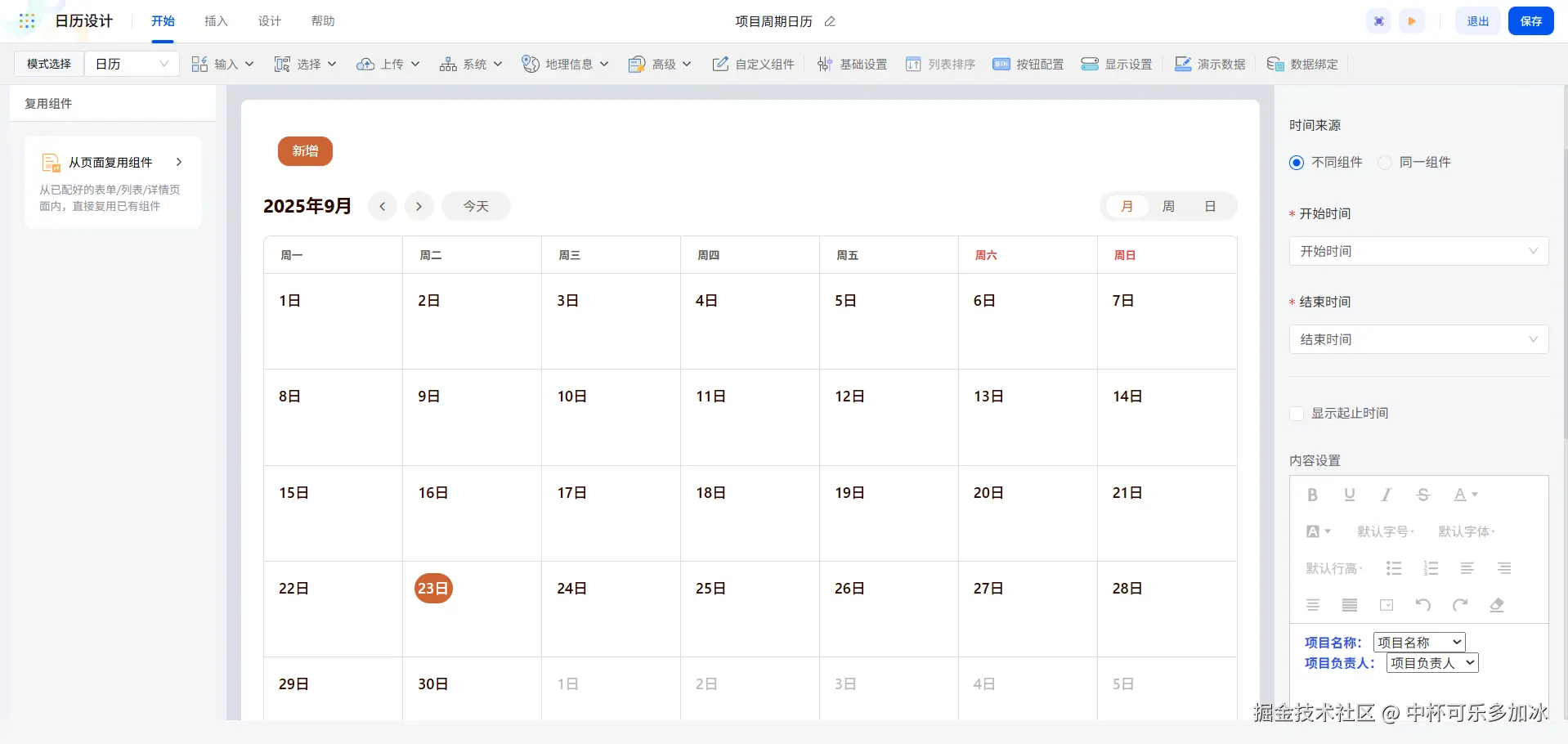 先看日历组件,它在展示项目排期方面发挥着重要作用。当我们进入日历组件配置页,只需快速插入所需字段,接着设定日历中项目的开始时间、结束时间以及想要展示的具体内容,最后绑定数据,操作简便快捷。